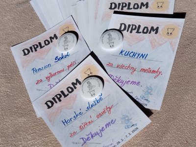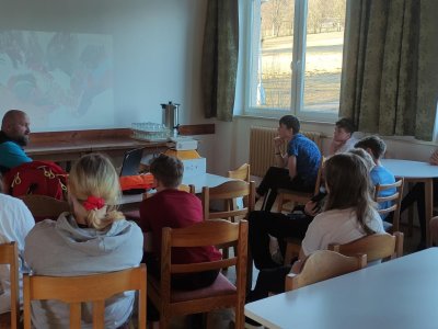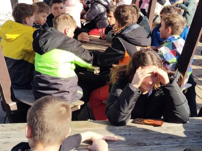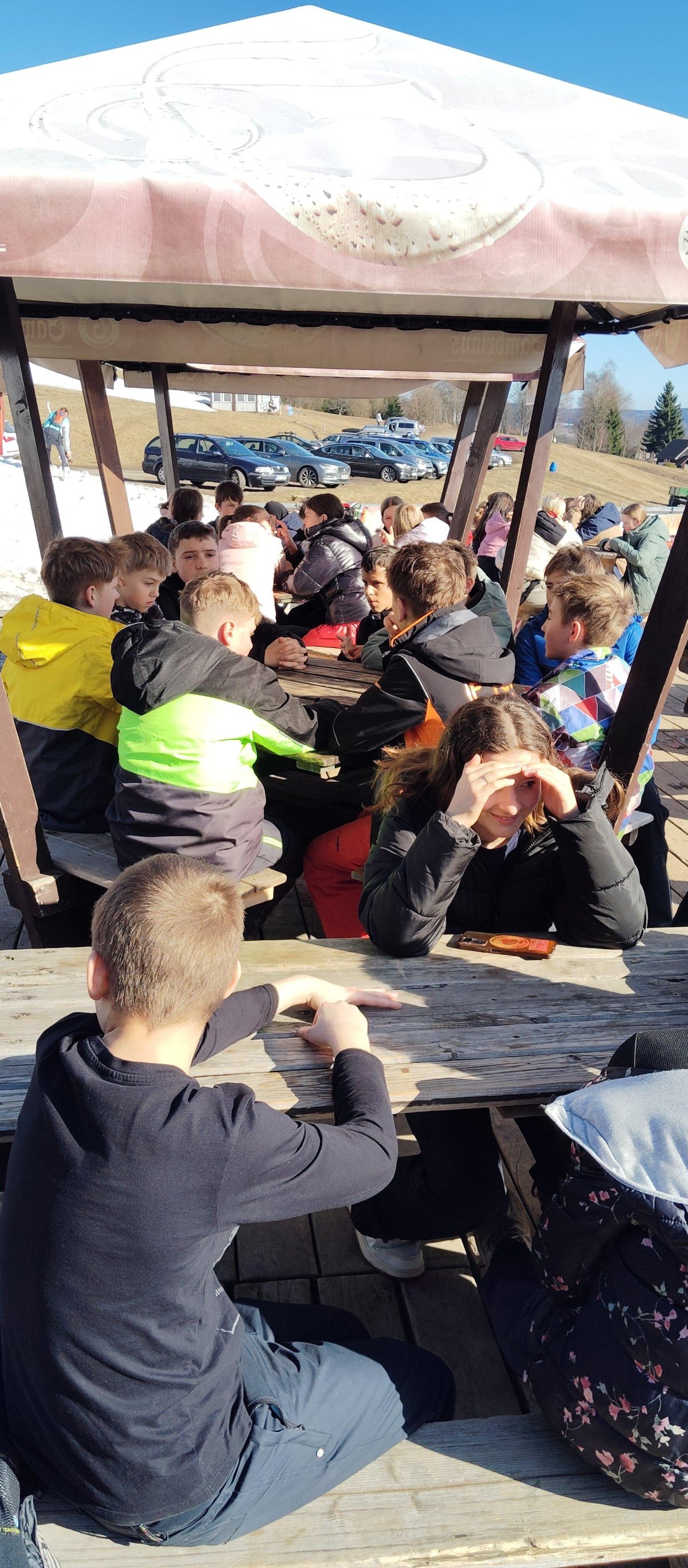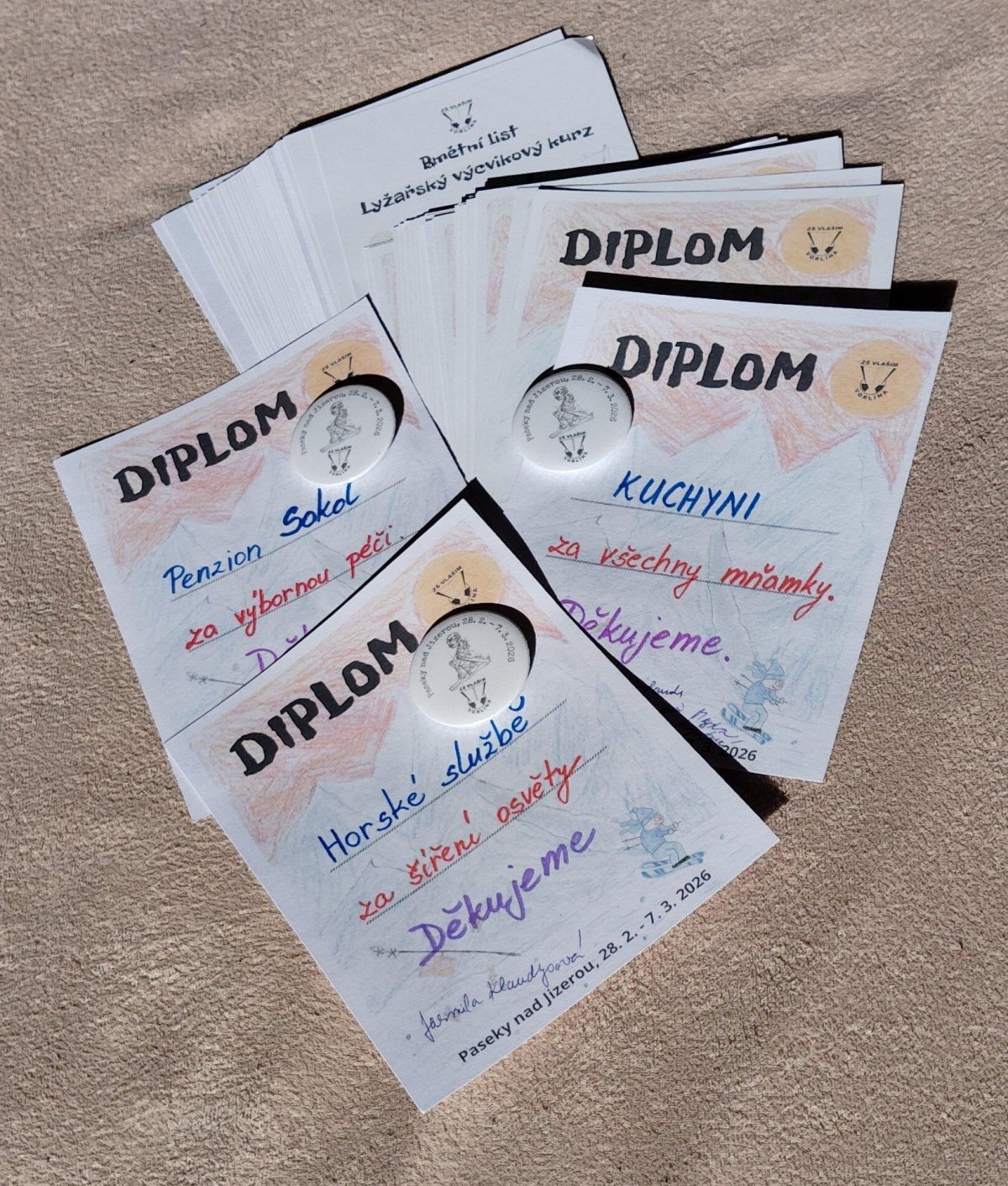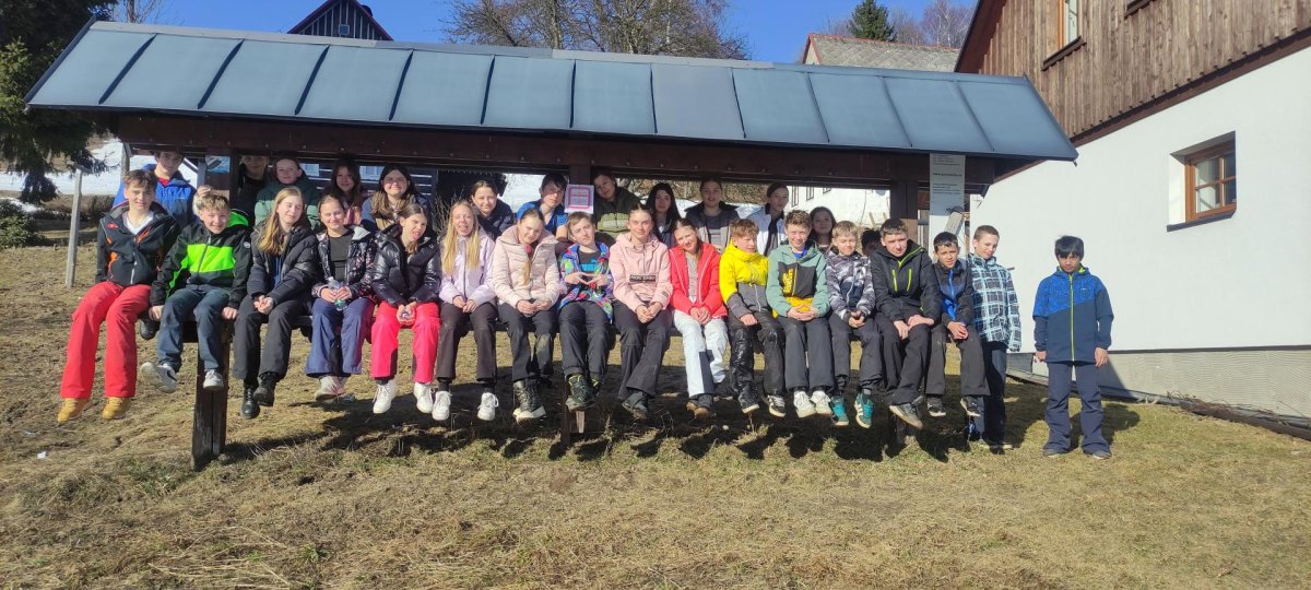 Dnes ráno jsme se opět probudili do slunečních paprsků. Po vydatné snídani jsme se přesunuli na svah, kde nás čekaly závěrečné závody ve sjezdovém lyžování. Závodníci jeli z plných sil. Po obědě nás čekala procházka k vleku a přesun lyží do lyžárny v chatě. Druhá cesta byla na Hermínu, kde nás čekalo malé občerstvení - horká čokoláda a hranolky. Proběhlo i velké focení u velké lavičky na přání paní učitelky Loulové. Po návratu do chaty, jsme začali balit lyže, lyžáky, helmy a věci na pokojích. V půl páté nás navštívil záchranář z Horské služby, aby nám povyprávěl o bezpečnosti na horách a poskytování první pomoci. Večerní program byl plný potlesku a předávání diplomů, medailí a pamětních listů. A v úplném závěru nesměla chybět diskotéka, kterou jsme si hooodně užili. Zítra se těšíme na viděnou ve Vlašimi.