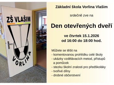 Srdečně zveme širokou veřejnost a především budoucí prvňáčky a jejich rodiče na náš Den otevřených dveří. Přijďte nasát atmosféru naší školy, seznámit se s učiteli a podívat se, jak u nás probíhá výuka.