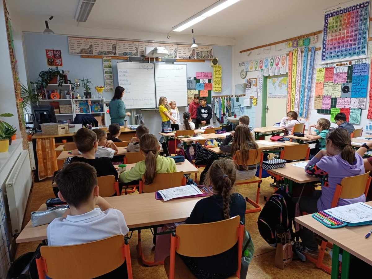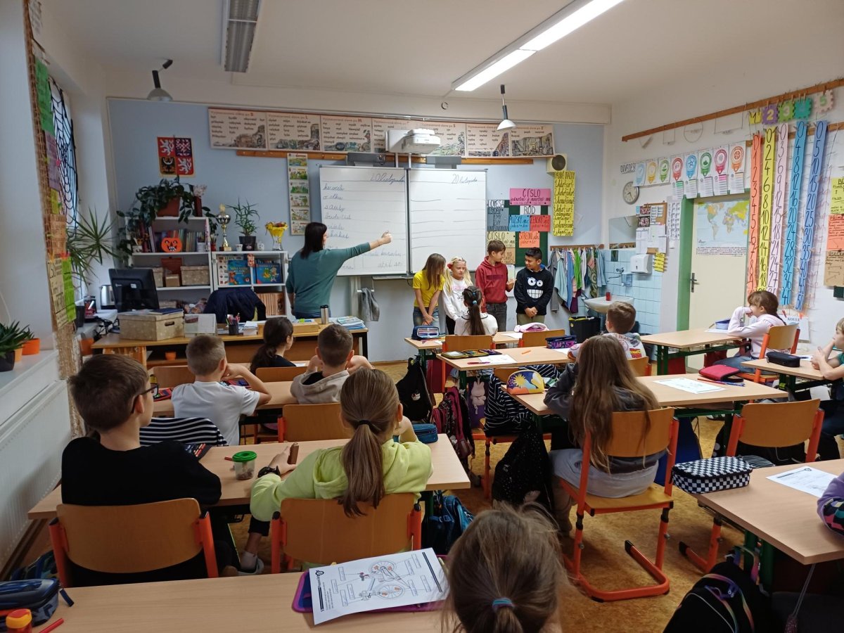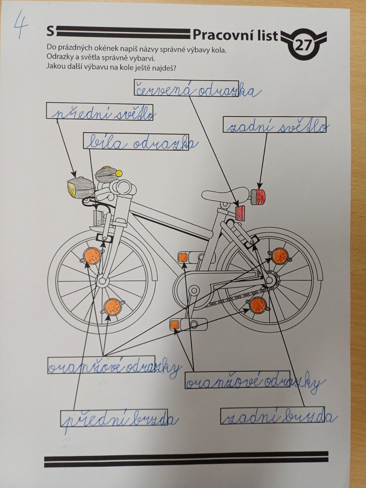 Ve čtvrtek ráno nás ve třídě navštívila paní Nedvědová, abychom si zopakovali základní pravidla silničního provozu a bezpečné cyklistiky. Připomněli jsme si, co patří do povinné výbavy kola, jak se na cyklistiku obléknout a jak si správně nastavit přilbu.