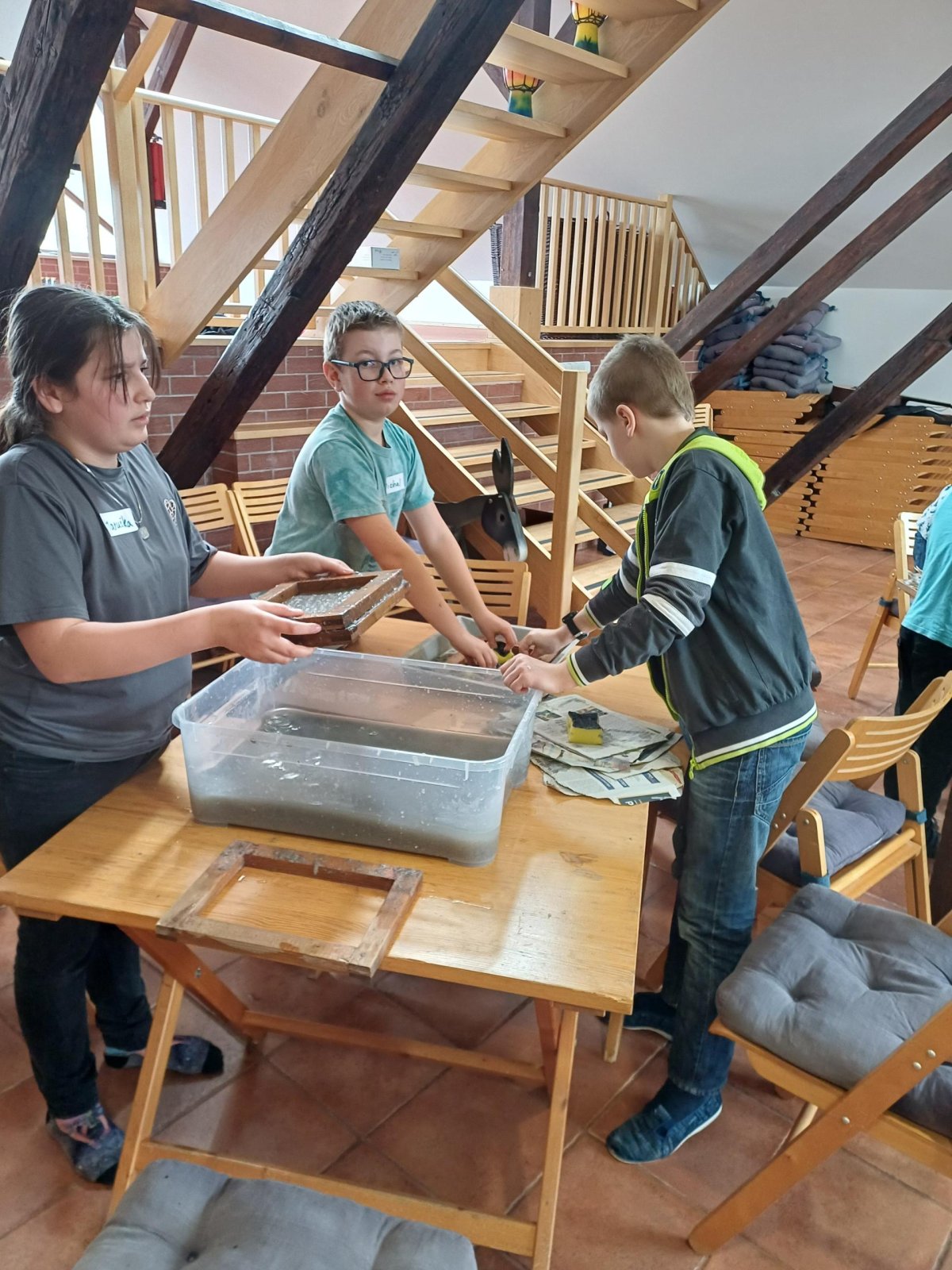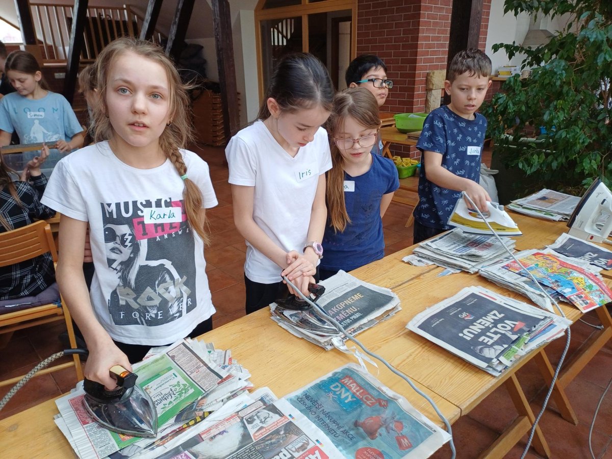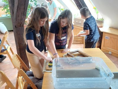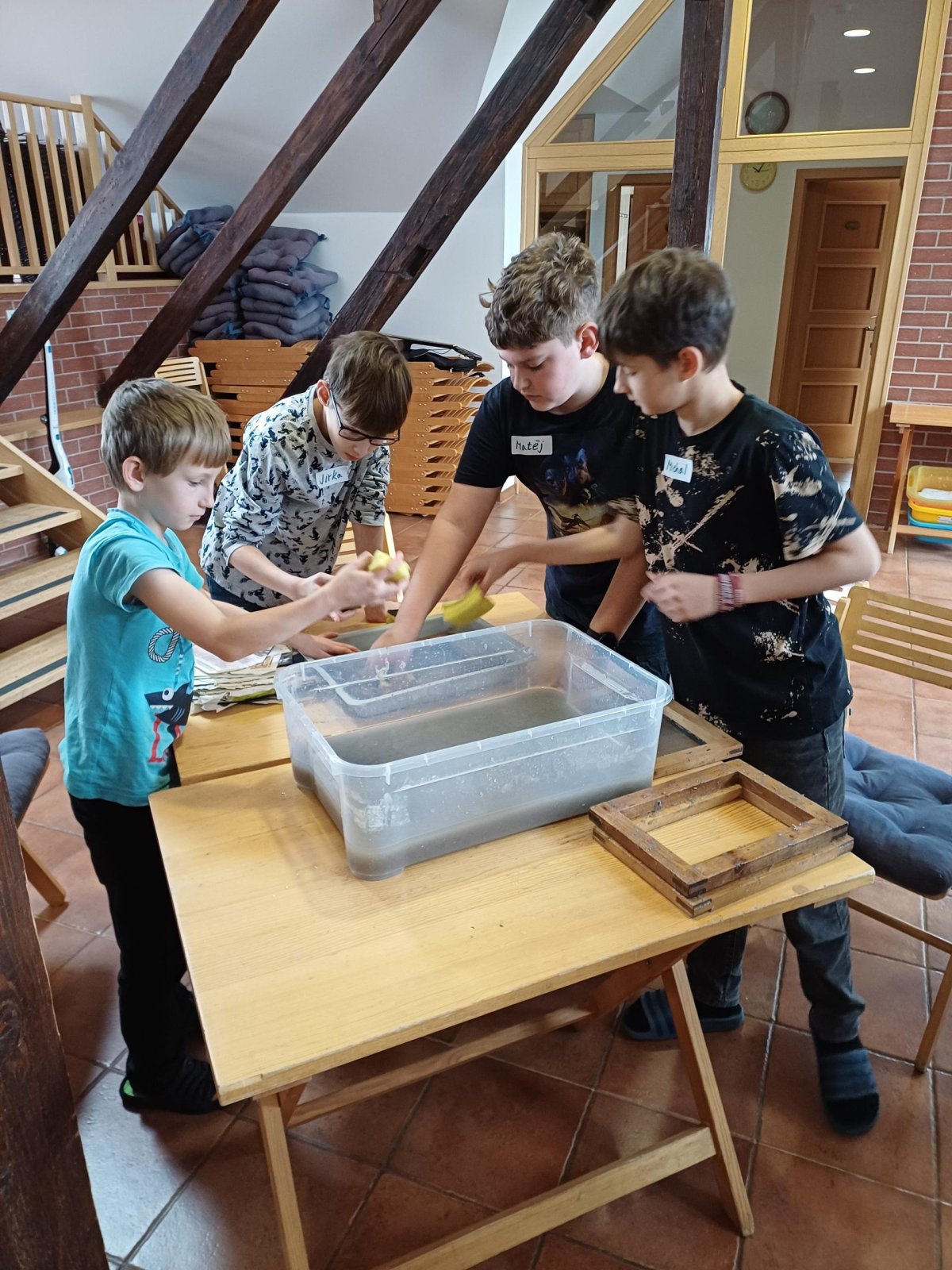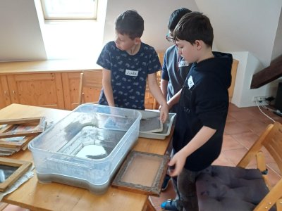 Po příchodu do Ekocentra jsme se přezuli, převlékli a vystoupali do podkroví, kde byla naše učebna. Dnešní program se jmenoval Cesta za papírem. Paní si pro nás připravili opravdu pestrý program. Vrcholem byla výroba vlastního listu papíru.