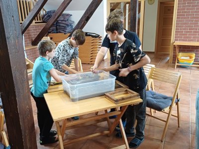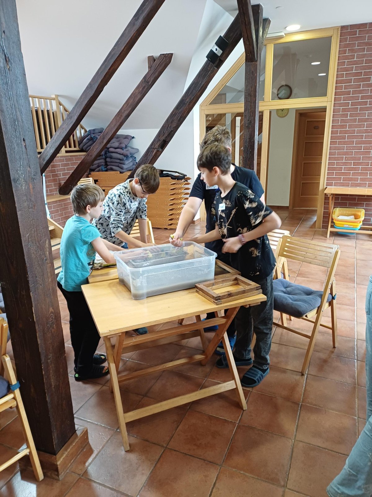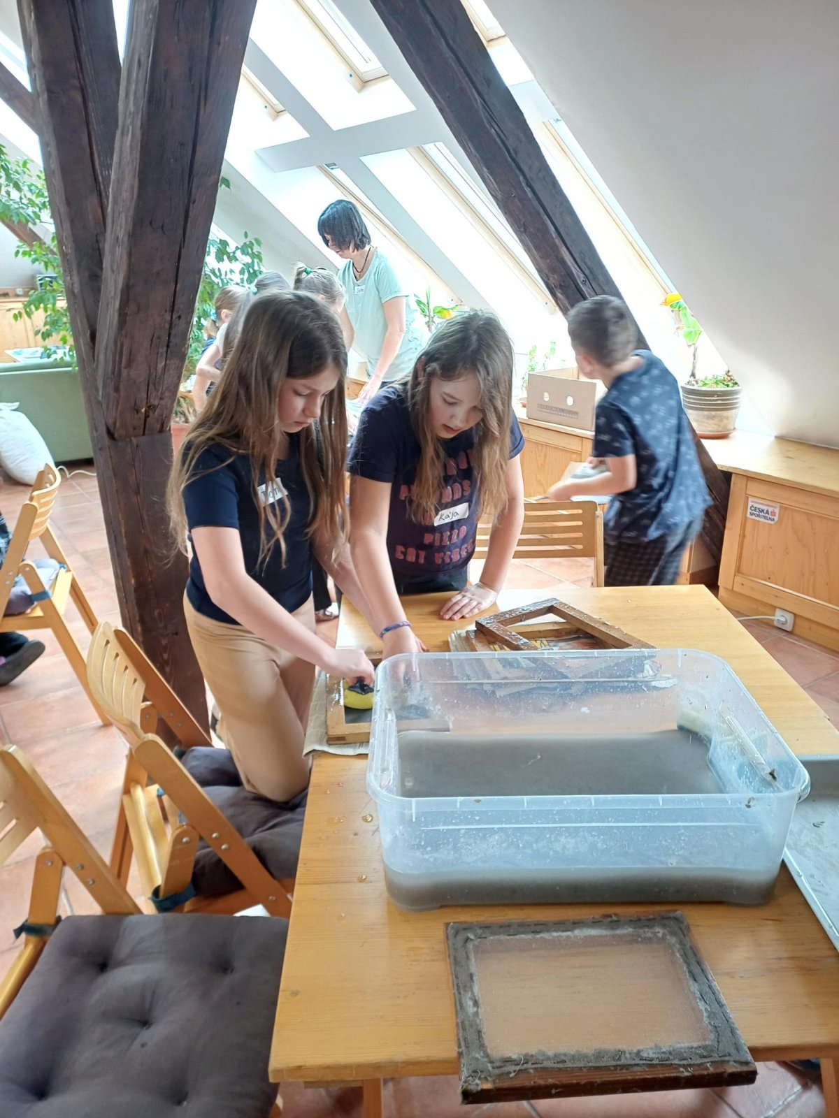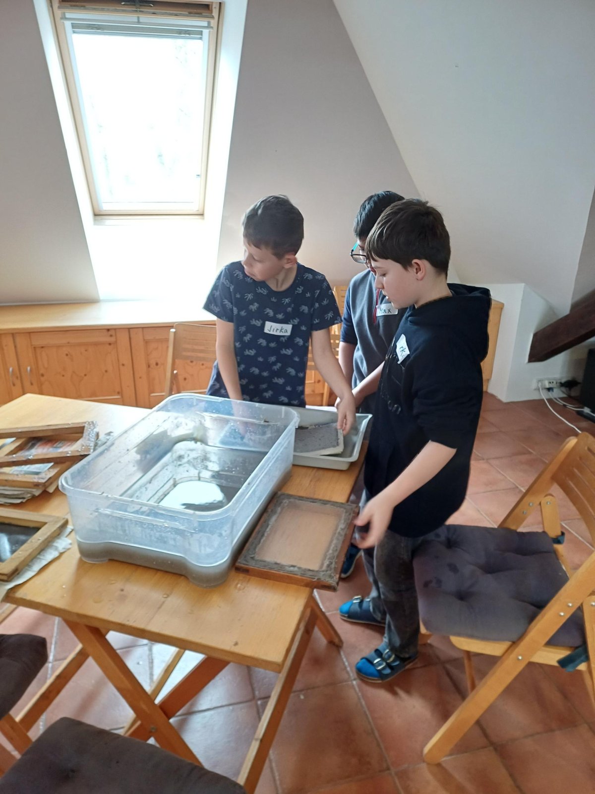 Po příchodu do Ekocentra jsme se přezuli, převlékli a vystoupali do podkroví, kde byla naše učebna. Dnešní program se jmenoval Cesta za papírem. Paní si pro nás připravili opravdu pestrý program. Vrcholem byla výroba vlastního listu papíru.