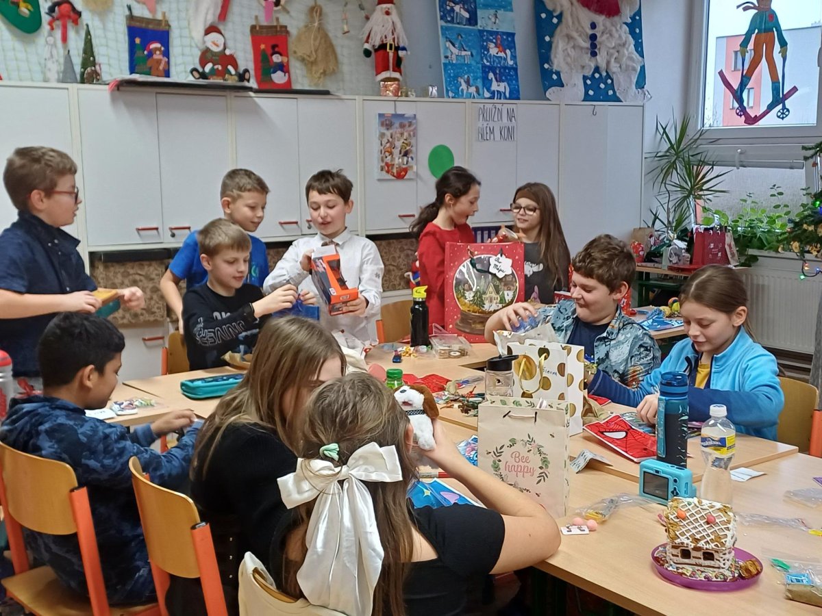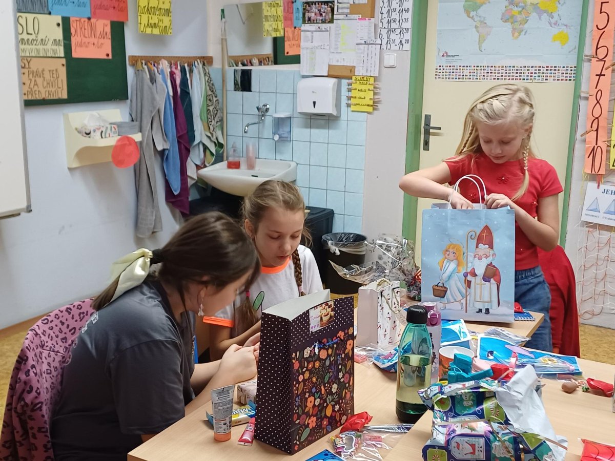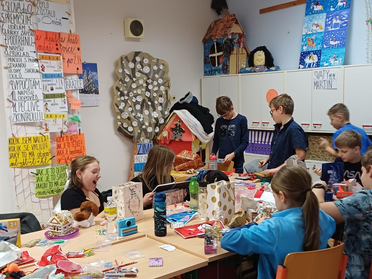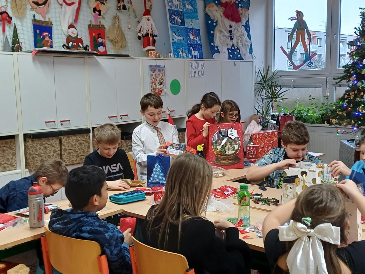 Pak jsme se pustili do rozdávání a rozbalování dárků. To bylo radosti! Letos bylo dárků více, protože pro děvčata a pro chlapce připravila speciální balíčky Oliverova maminka. Oliver v lednu bude chodit na jinou školu, tak jsme se s ním loučili. Všichni mu přejeme vše dobré. Doufáme, že se ještě někdy uvidíme.