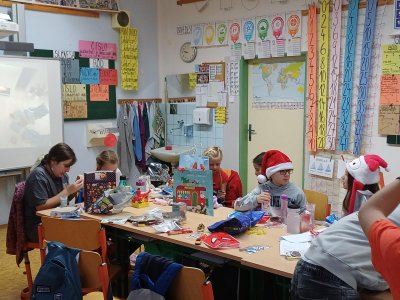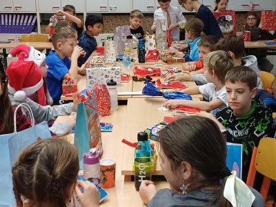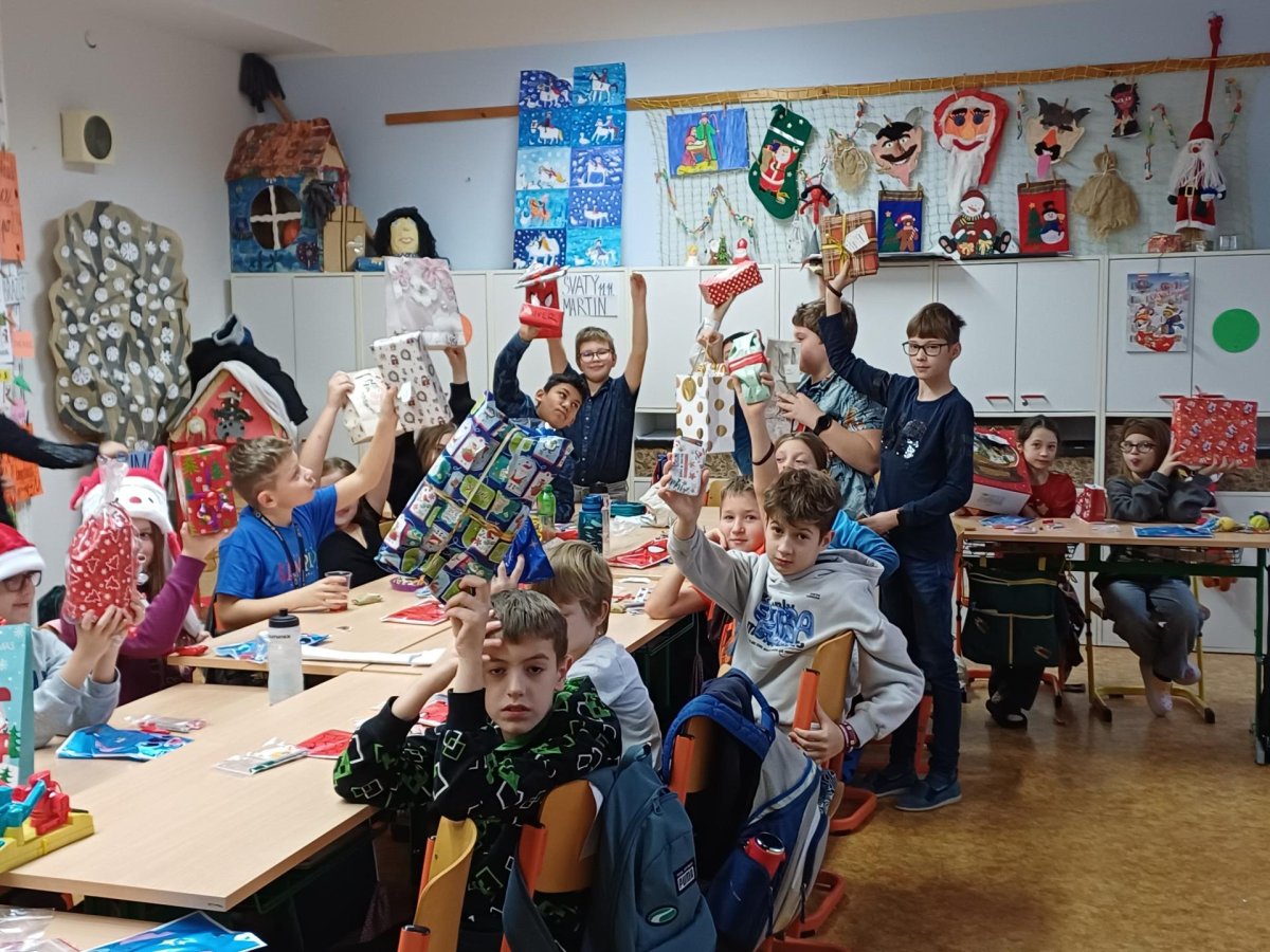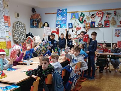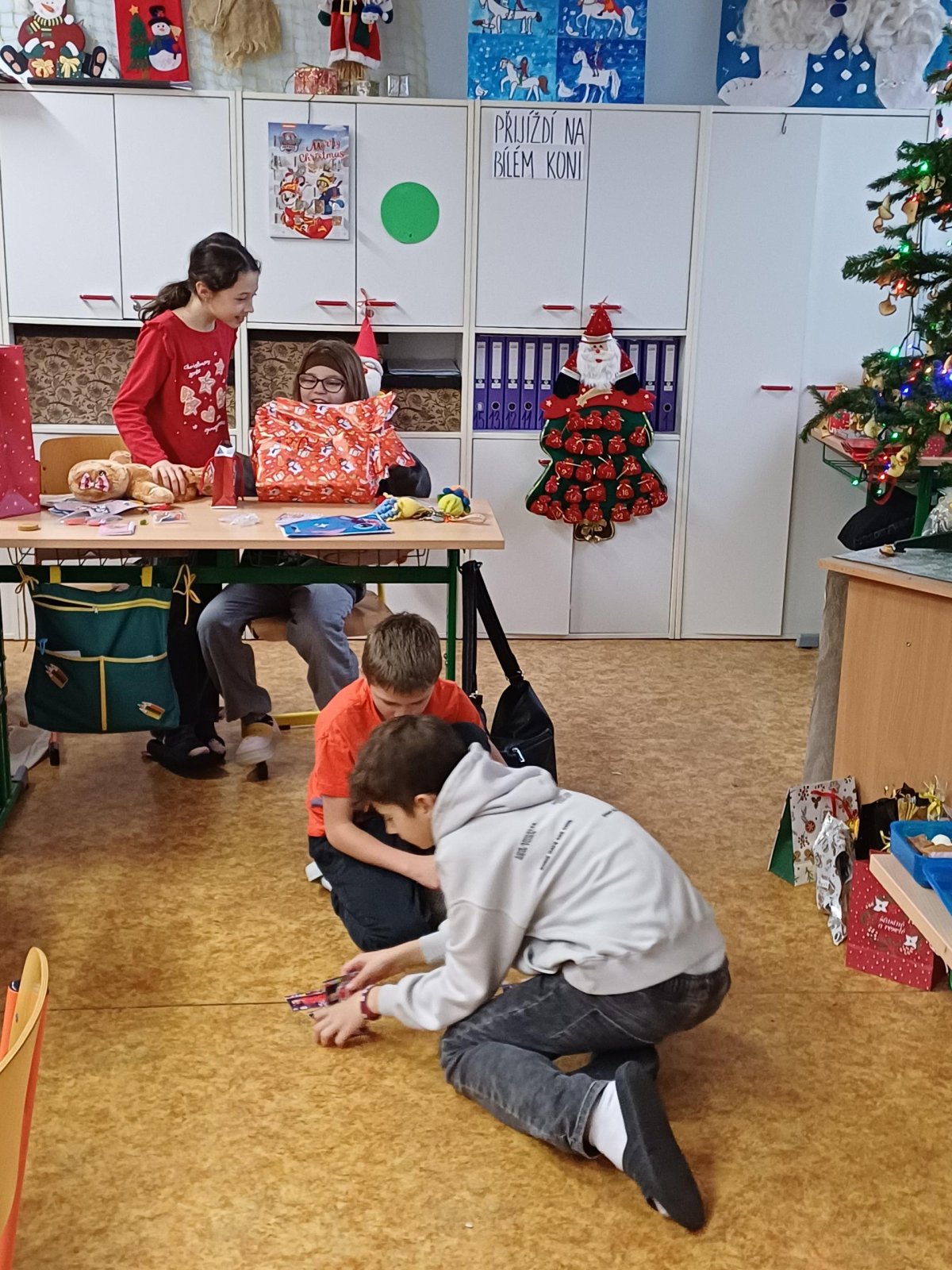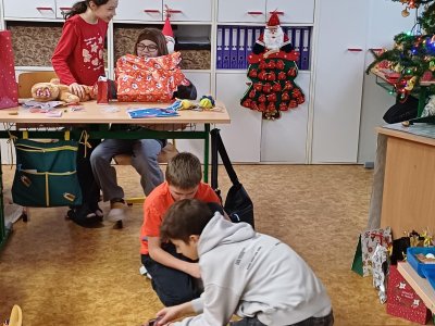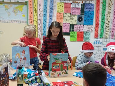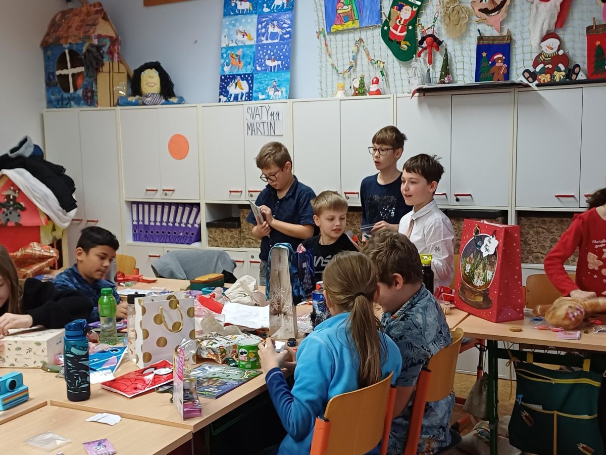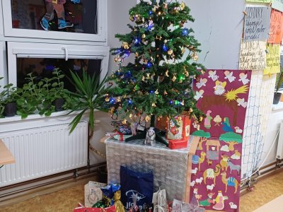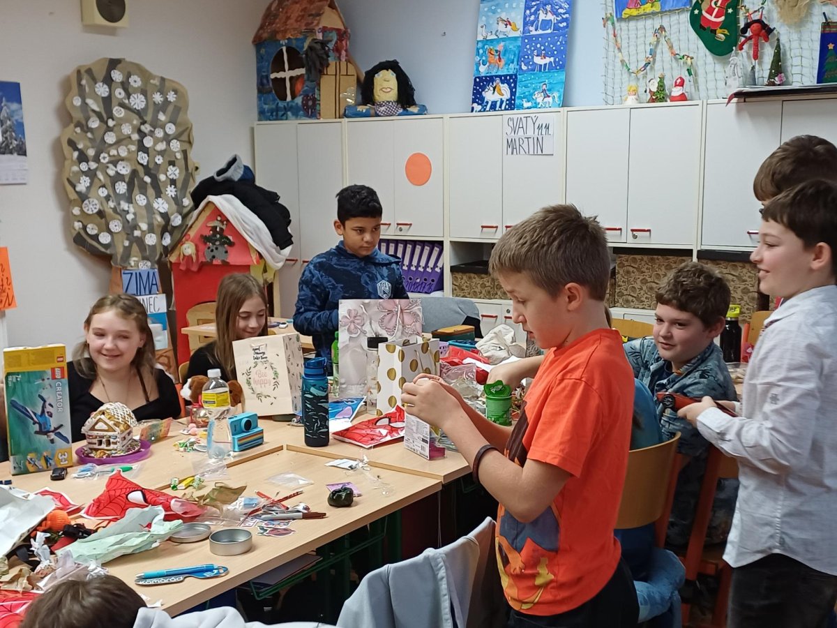 Pak jsme se pustili do rozdávání a rozbalování dárků. To bylo radosti! Letos bylo dárků více, protože pro děvčata a pro chlapce připravila speciální balíčky Oliverova maminka. Oliver v lednu bude chodit na jinou školu, tak jsme se s ním loučili. Všichni mu přejeme vše dobré. Doufáme, že se ještě někdy uvidíme.