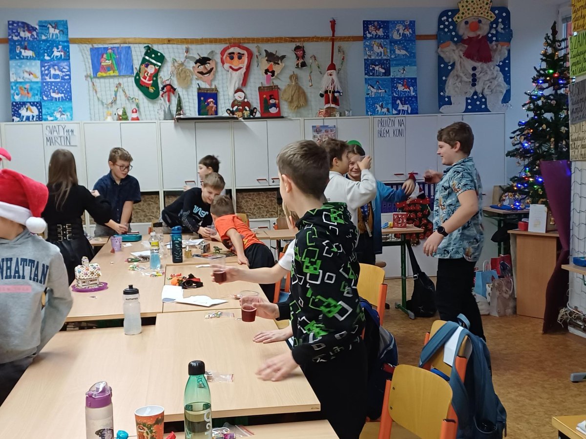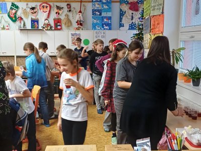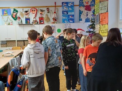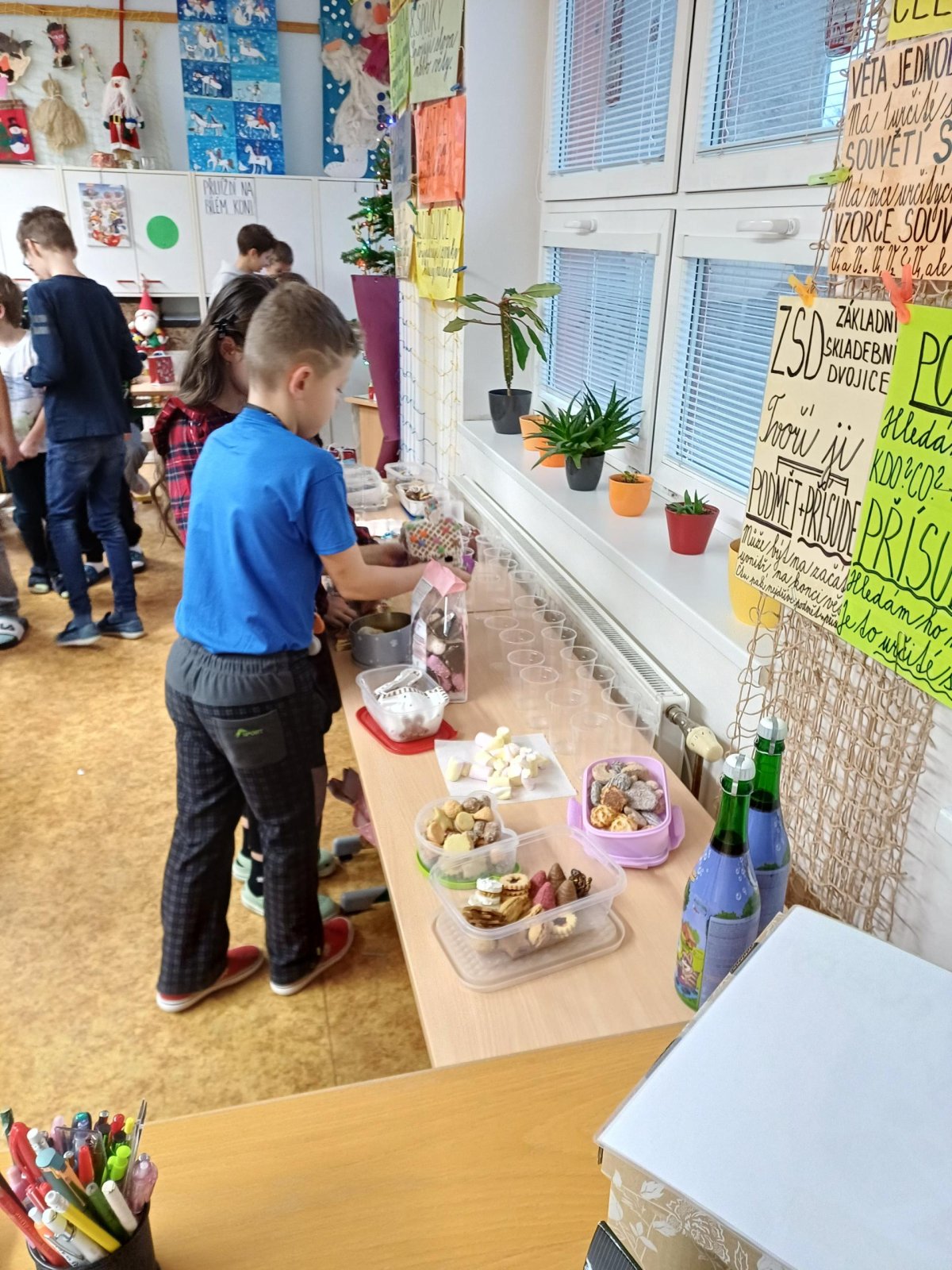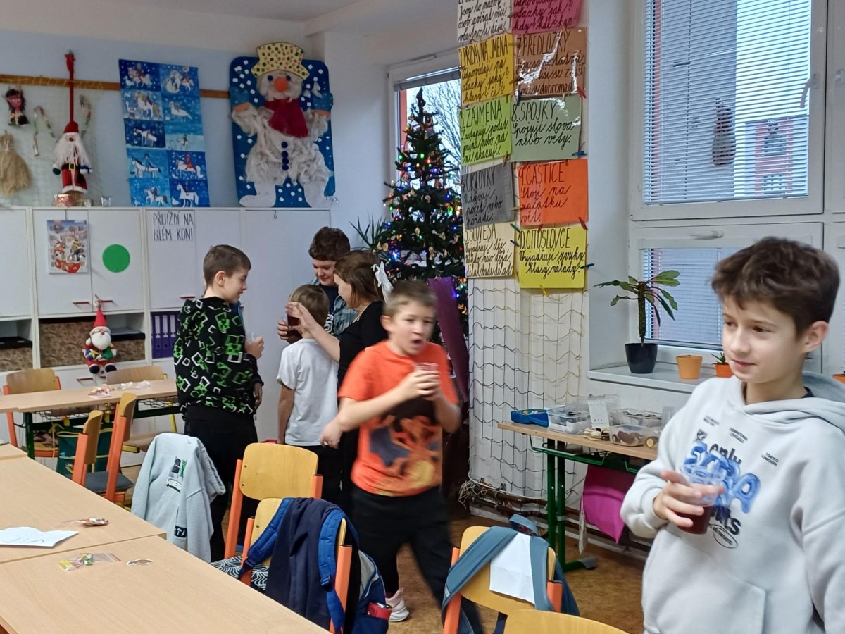 Na pátek 19. prosince jsme se všichni moc těšili. Byl to poslední den před vánočními prázdninami. Chystali jsme se na něj dlouho dopředu. Vymýšleli jsme si dárek pro svého kamaráda, pak jsme ho díky našim rodičům mohli koupit, zabalit a položit pod třídní stromeček. Den předem jsme si upravili umístění lavic, aby vznikla velká vánoční tabule. Rovněž jsme si zarezervovali svá místa :-))