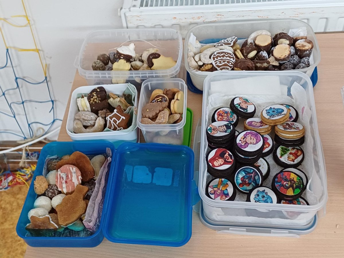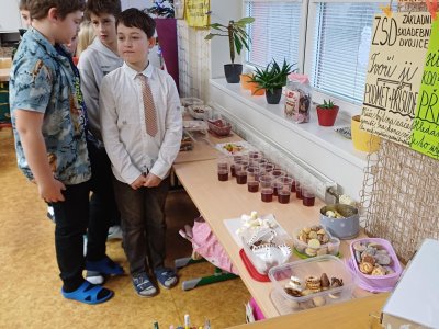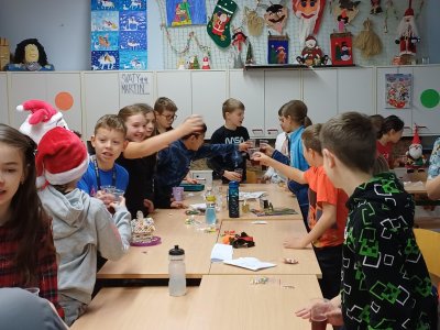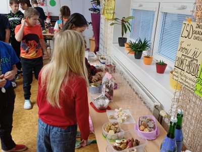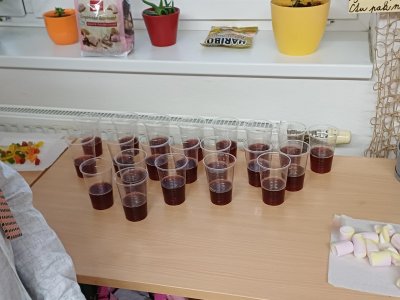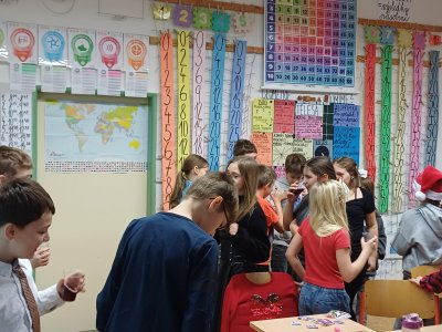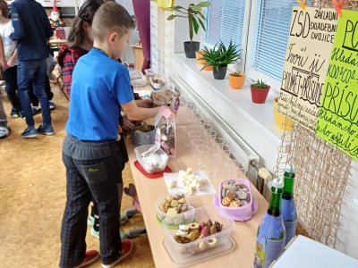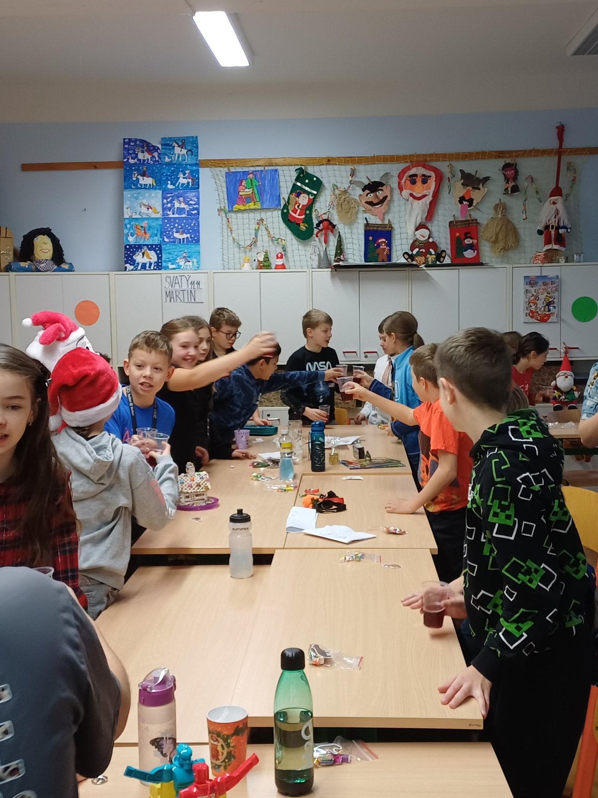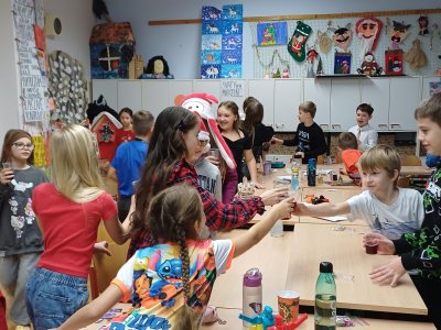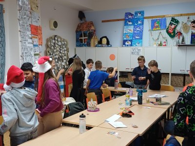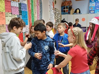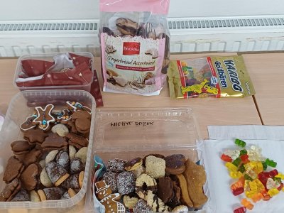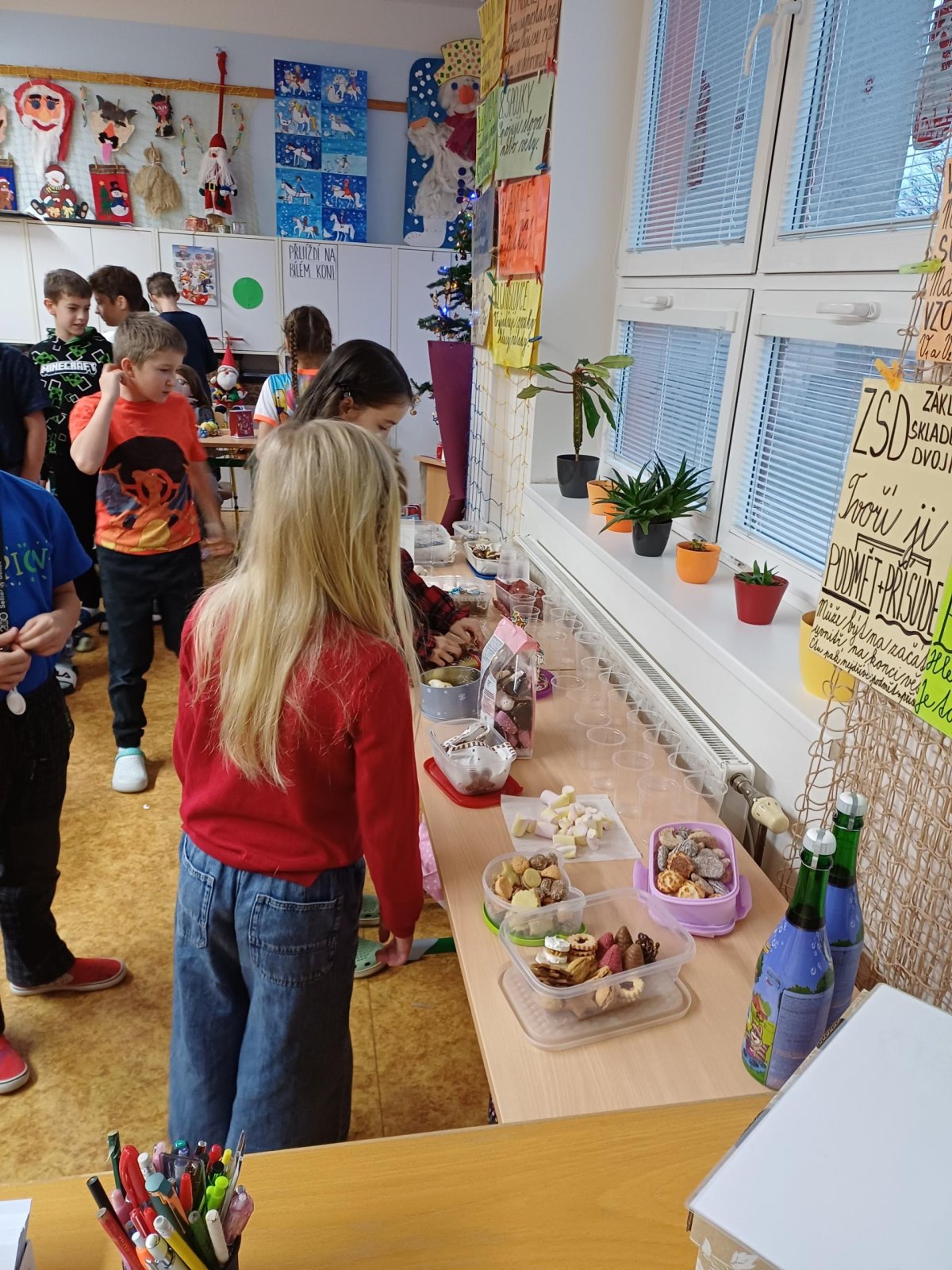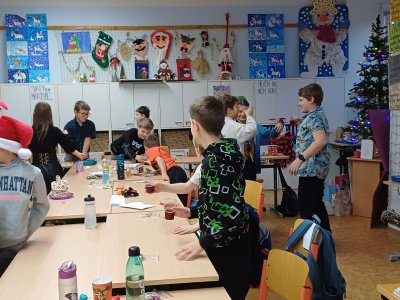 Ráno 19. 12. jsme přinesli trochu cukroví na ochutnání. Byla to opravdu dobrota! Naše maminky jsou šikovné cukrářky! Dali jsme to na společný stůl a mlsali. Maminka Olivera nám koupila dokonce šampaňské, tak jsme si na začátku připili a popřáli si krásné Vánoce.
