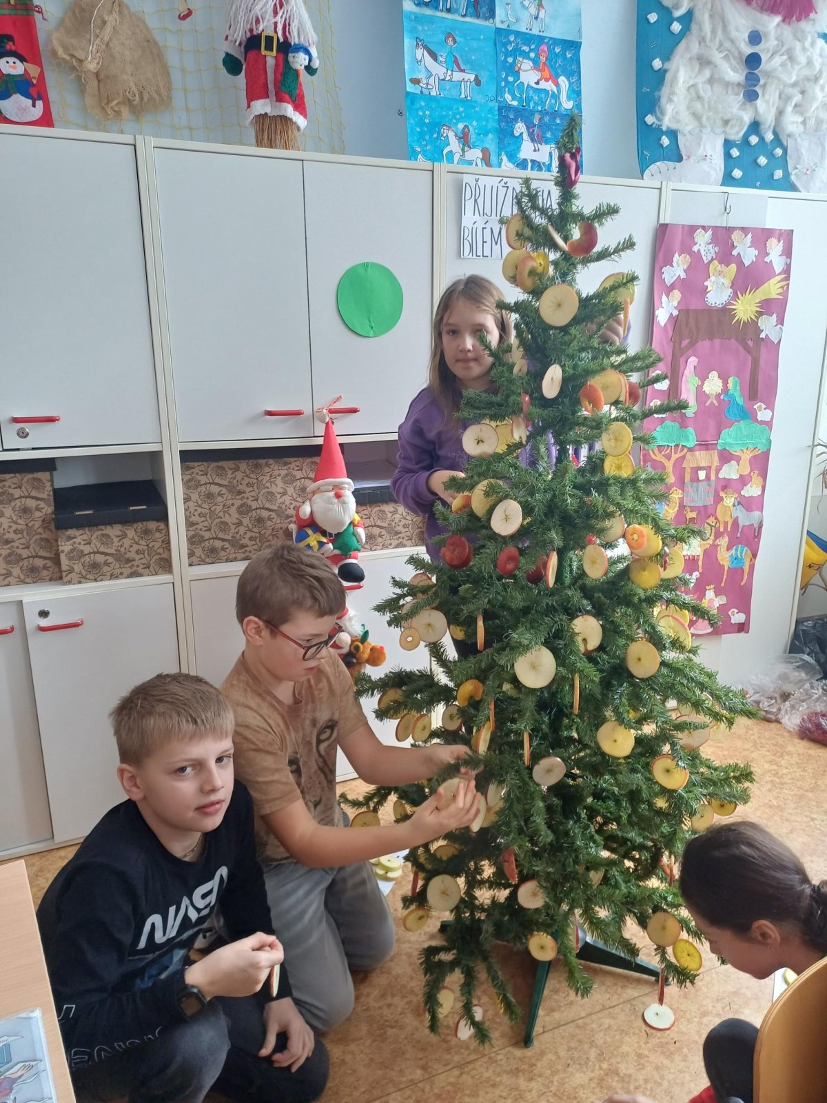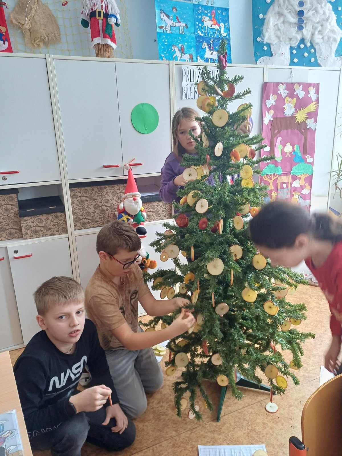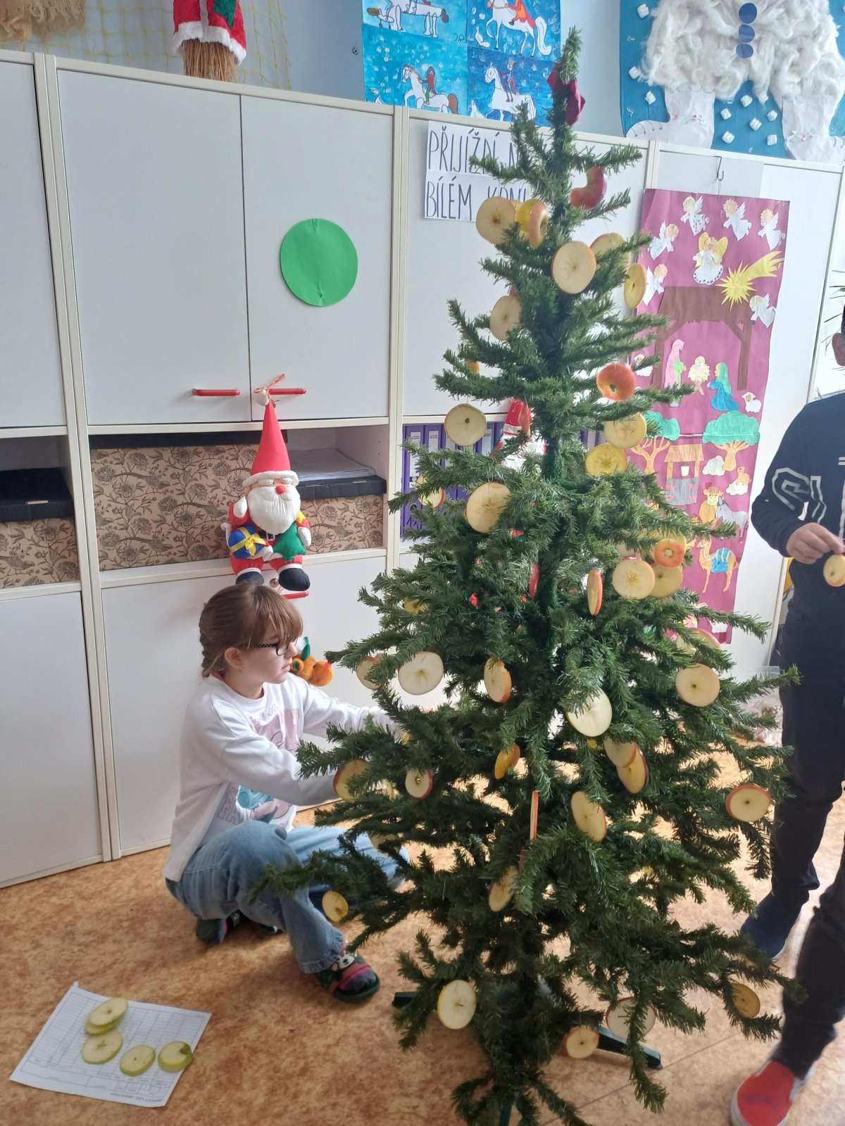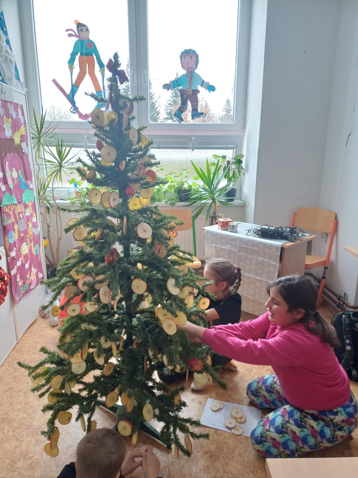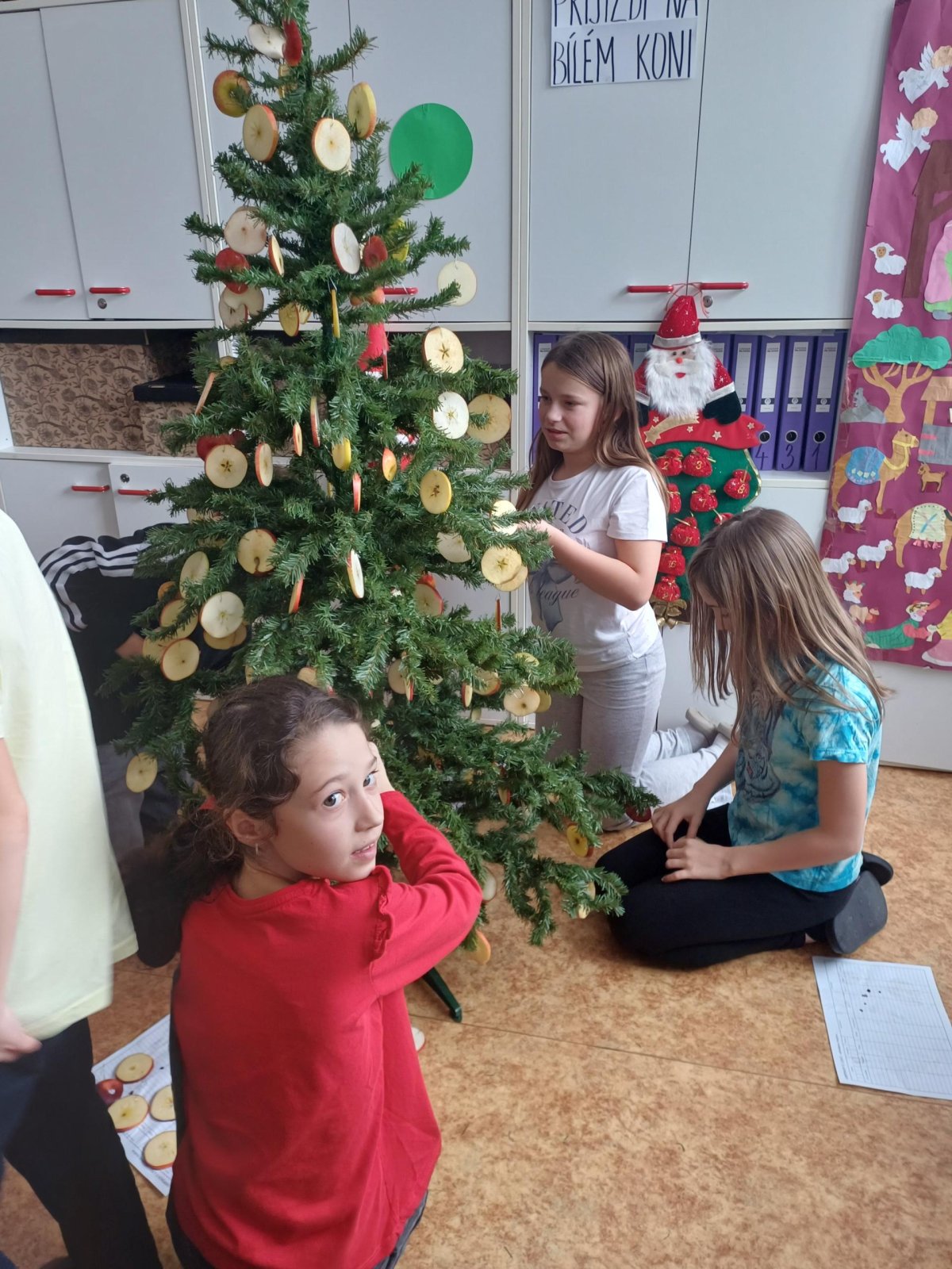 Ve čtvrteční hodině ČLSP opět přišel čas na ozdobení vánočního stromečku. Každý si přinesl jablko, paní učitelka krájela na tenké plátky. My jsme pak pečlivě navlékli háček na jablko a připevnili jsme každý plátek na stromeček. Na závěr jsme rozvěsili svíčky a stromeček byl za hodinu nastrojený. Opravdu mu to sluší!