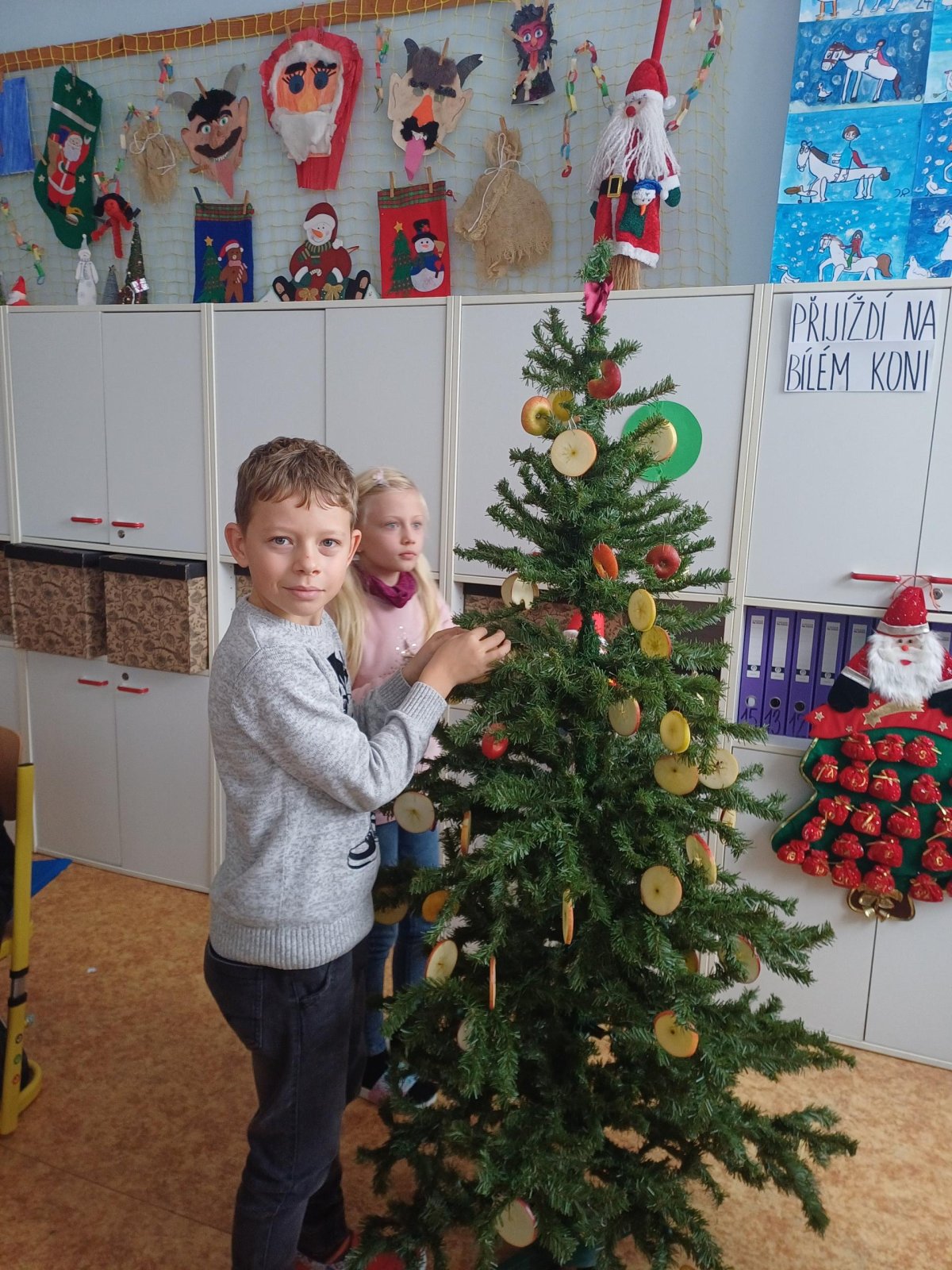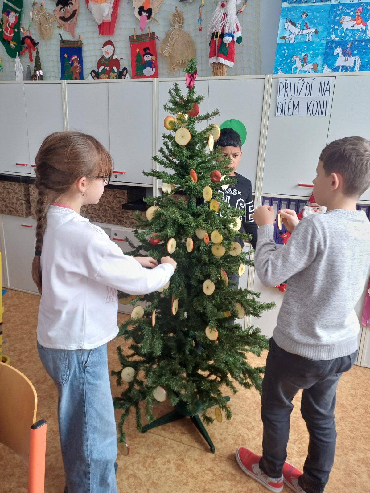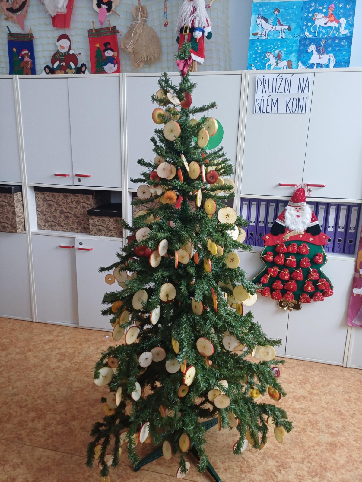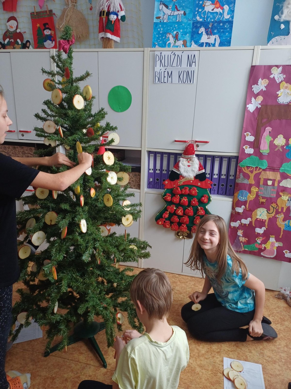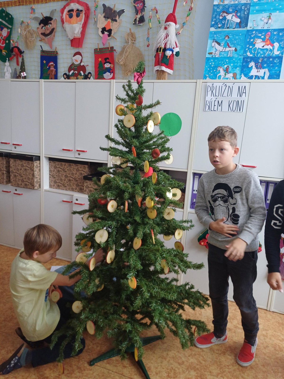 Ve čtvrteční hodině ČLSP opět přišel čas na ozdobení vánočního stromečku. Každý si přinesl jablko, paní učitelka krájela na tenké plátky. My jsme pak pečlivě navlékli háček na jablko a připevnili jsme každý plátek na stromeček. Na závěr jsme rozvěsili svíčky a stromeček byl za hodinu nastrojený. Opravdu mu to sluší!