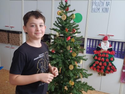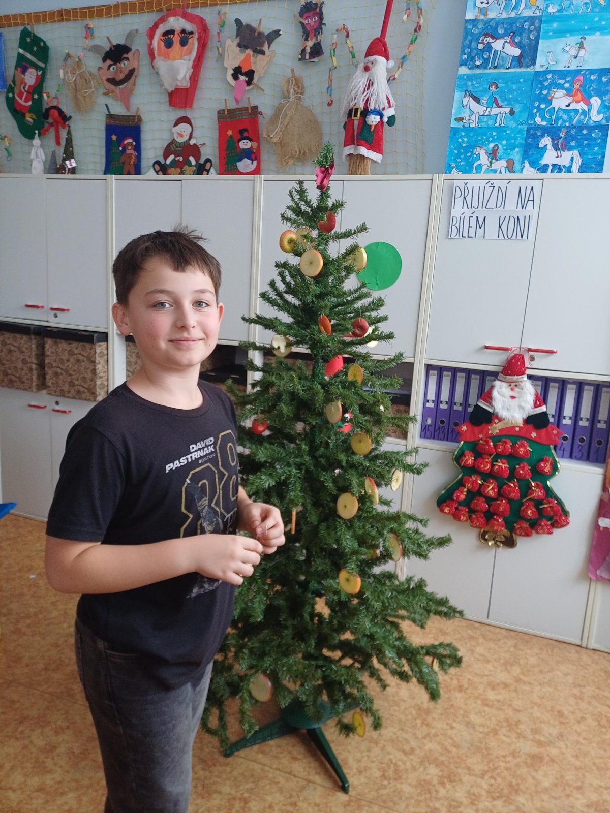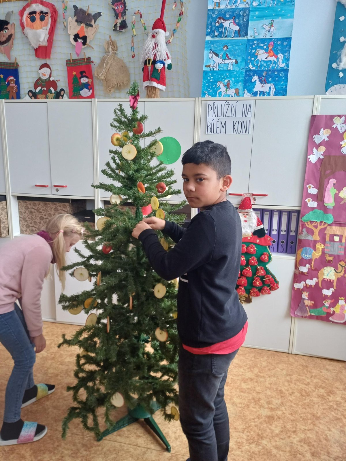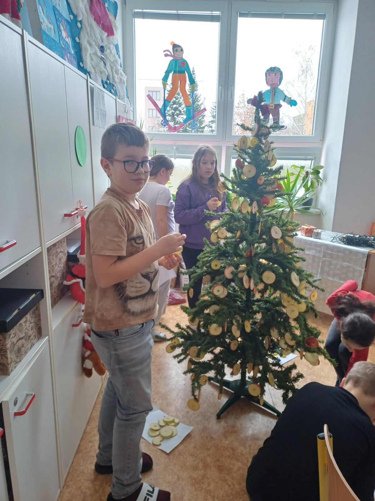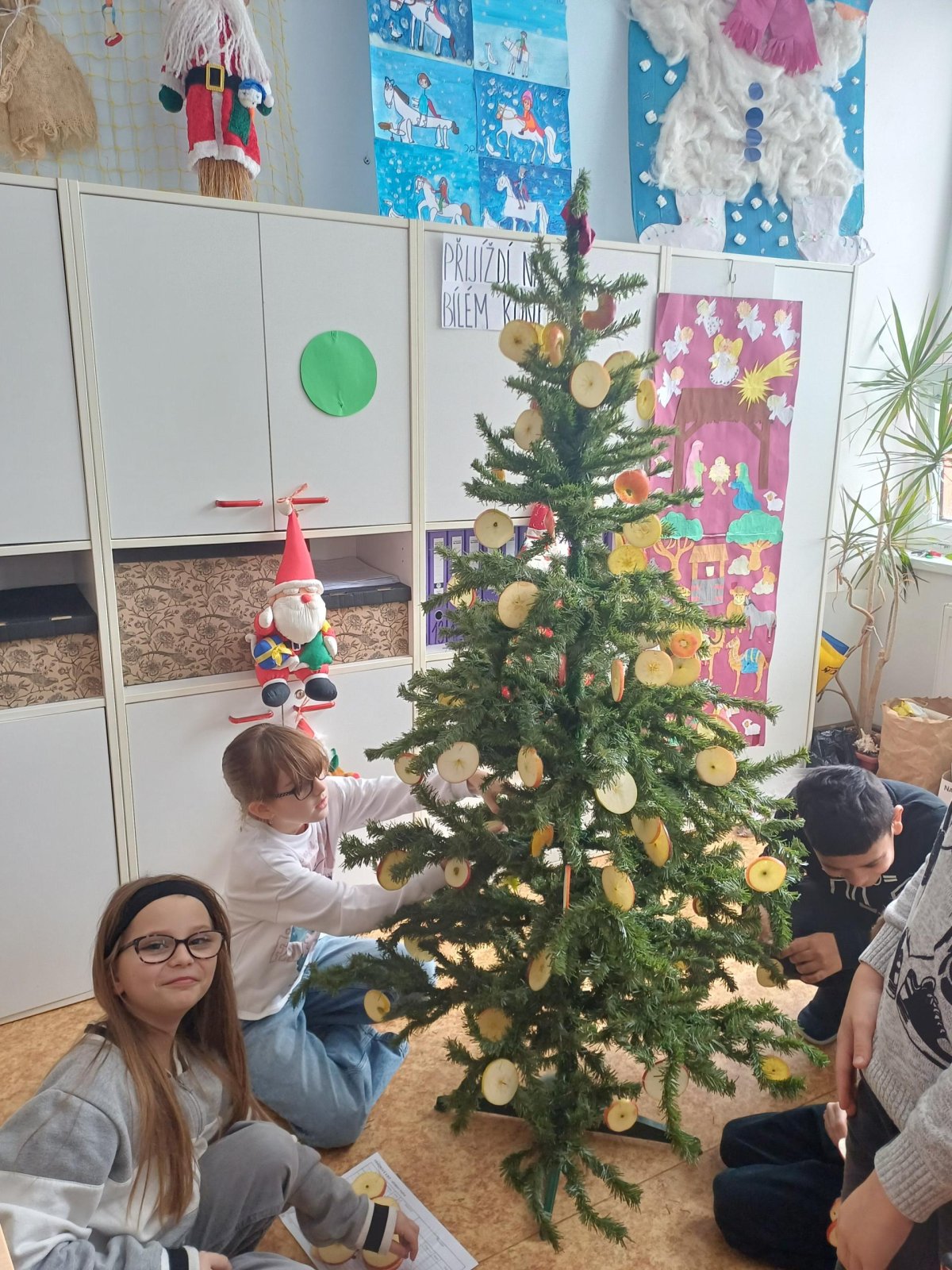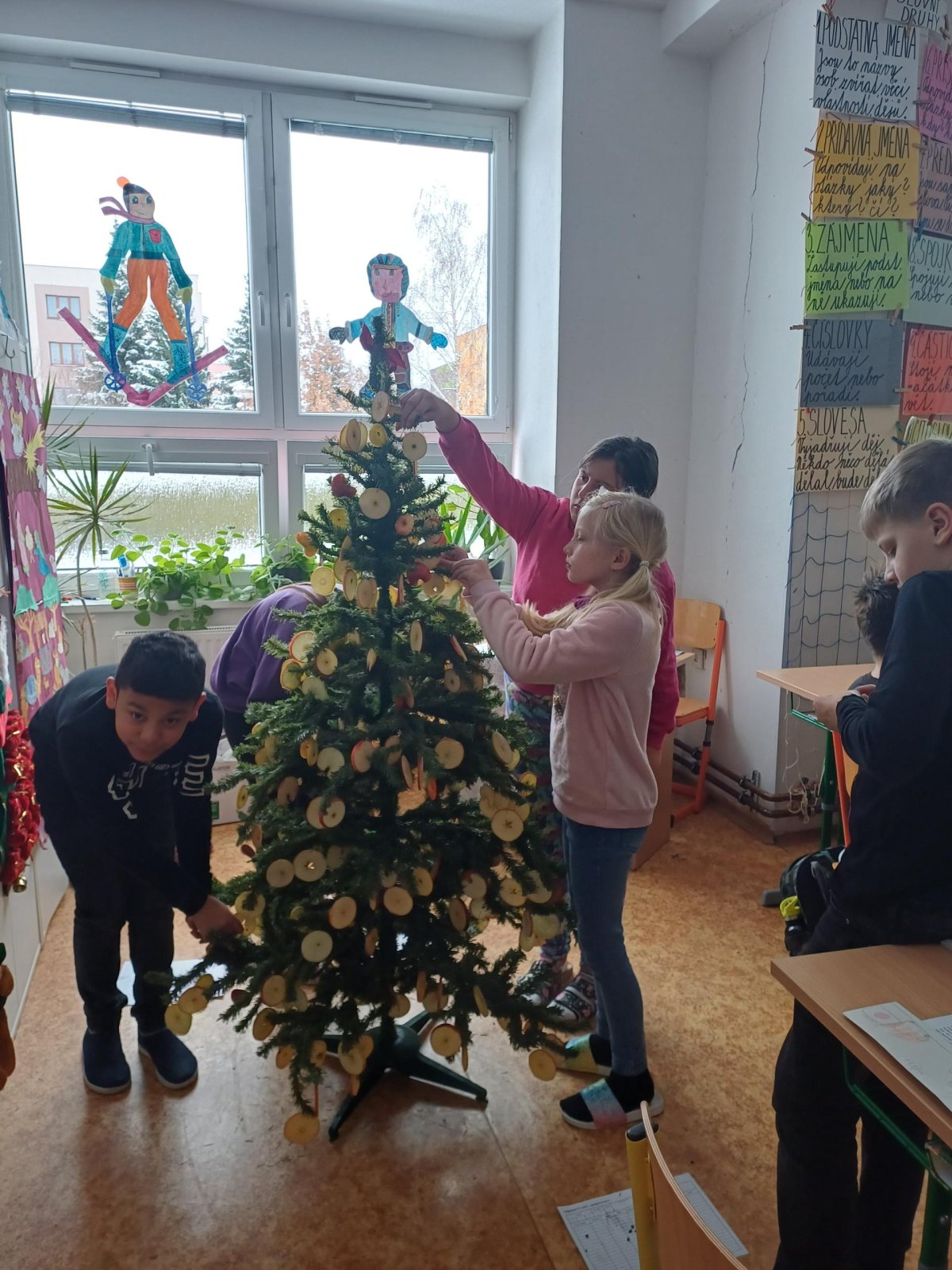 Ve čtvrteční hodině ČLSP opět přišel čas na ozdobení vánočního stromečku. Každý si přinesl jablko, paní učitelka krájela na tenké plátky. My jsme pak pečlivě navlékli háček na jablko a připevnili jsme každý plátek na stromeček. Na závěr jsme rozvěsili svíčky a stromeček byl za hodinu nastrojený. Opravdu mu to sluší!
