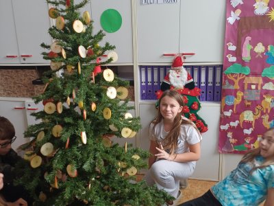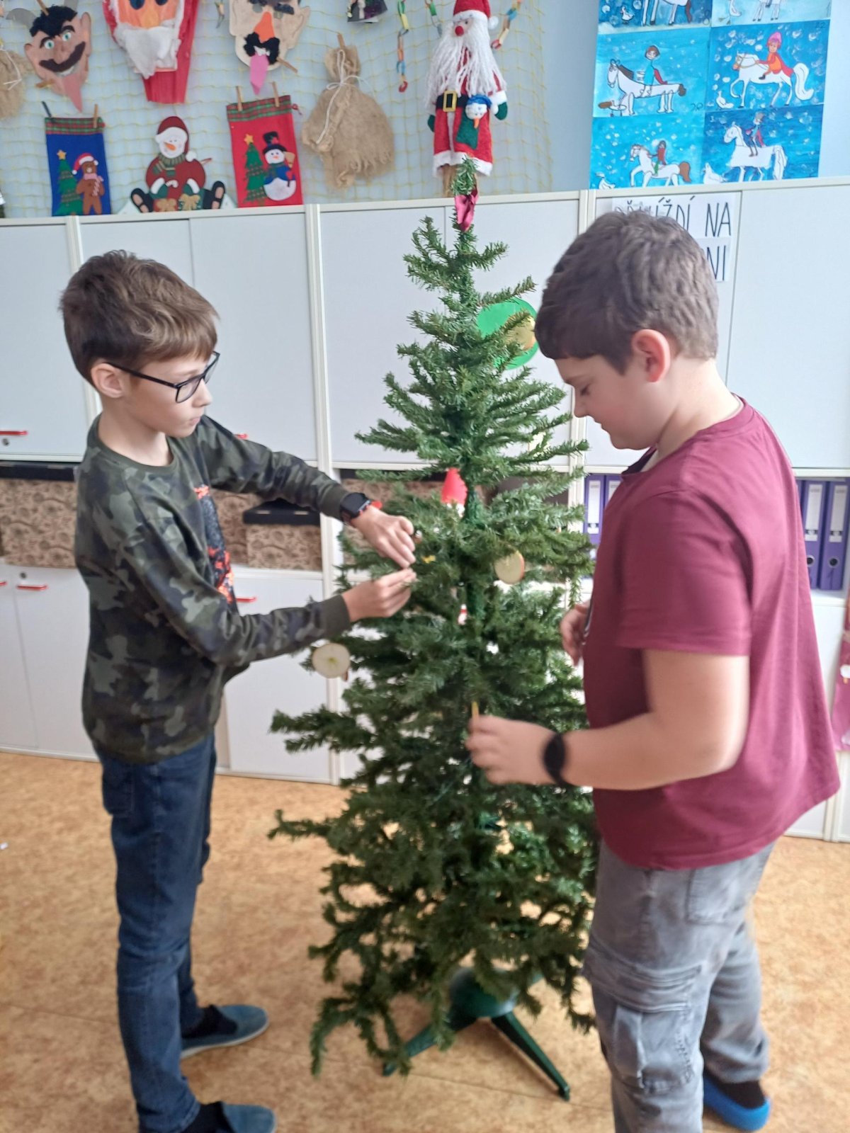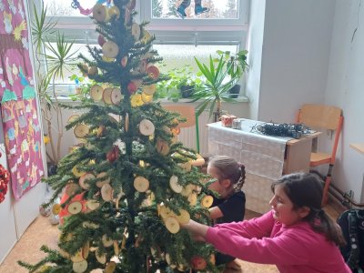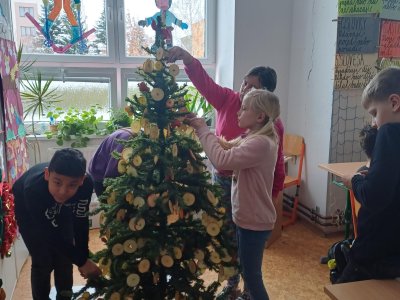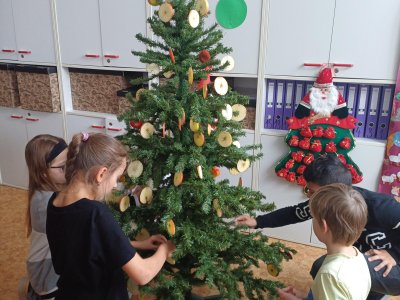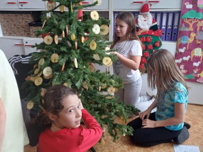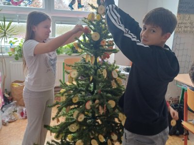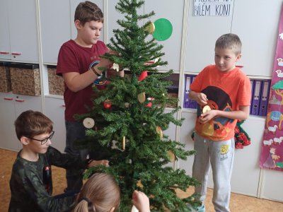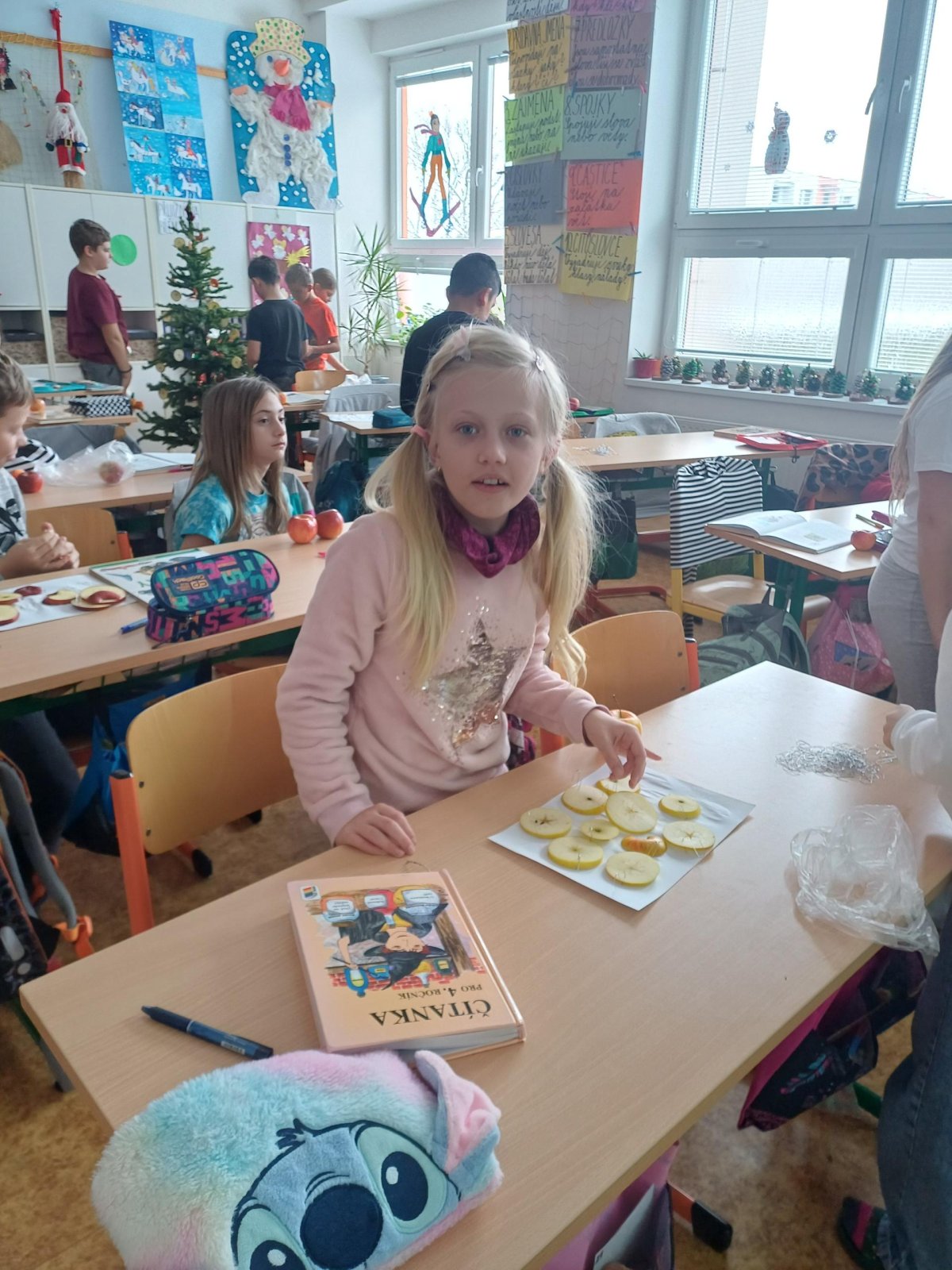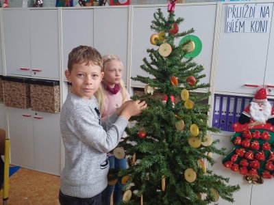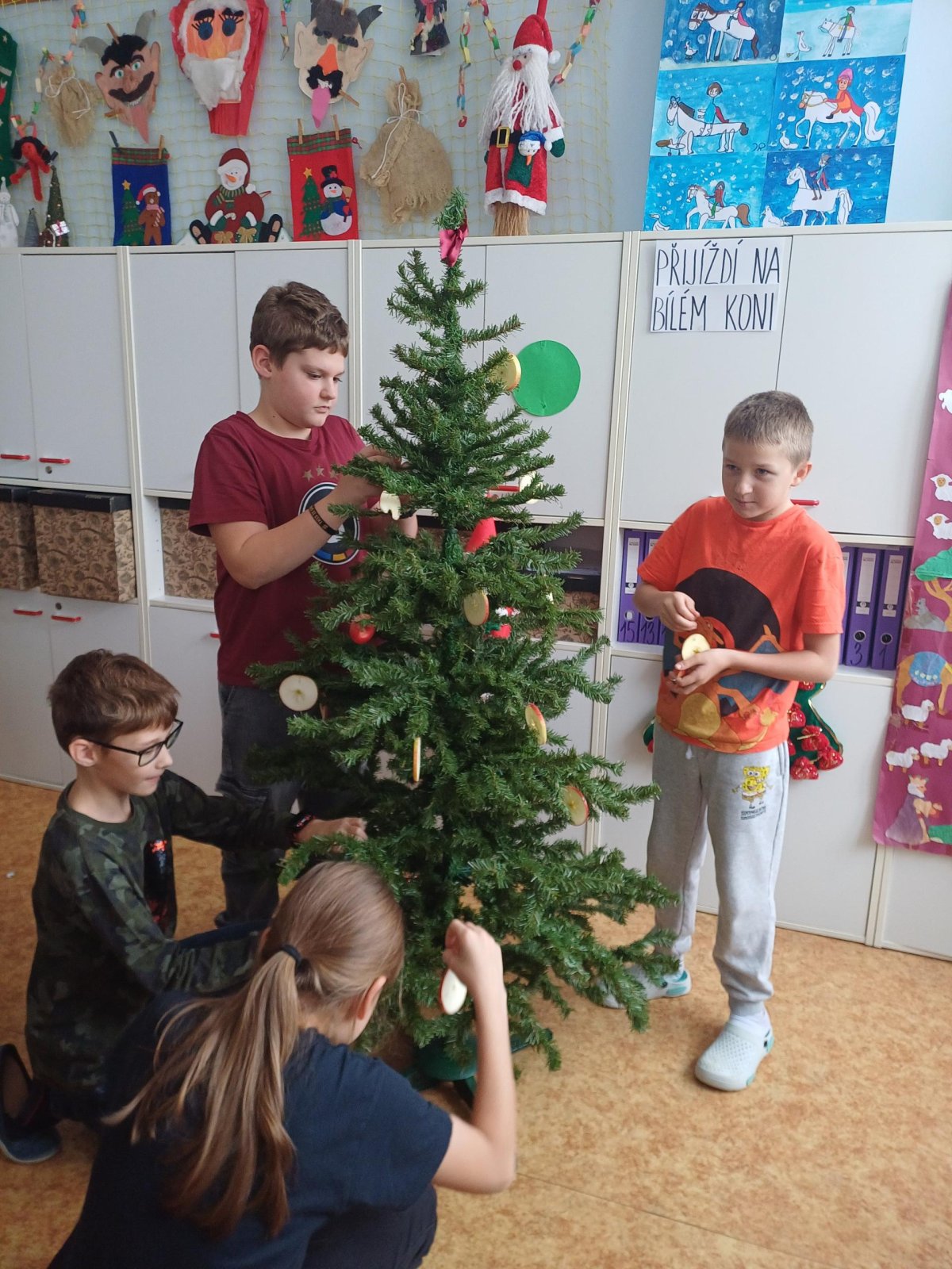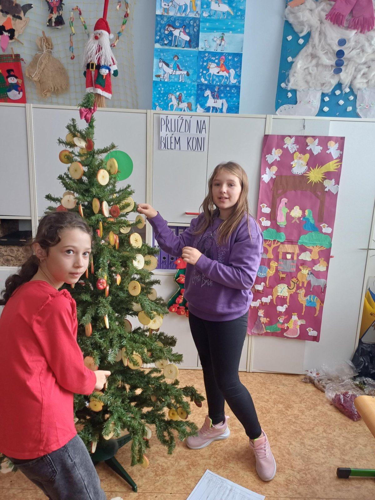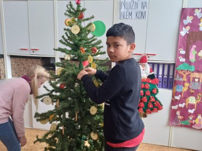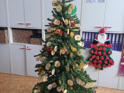 Ve čtvrteční hodině ČLSP opět přišel čas na ozdobení vánočního stromečku. Každý si přinesl jablko, paní učitelka krájela na tenké plátky. My jsme pak pečlivě navlékli háček na jablko a připevnili jsme každý plátek na stromeček. Na závěr jsme rozvěsili svíčky a stromeček byl za hodinu nastrojený. Opravdu mu to sluší!