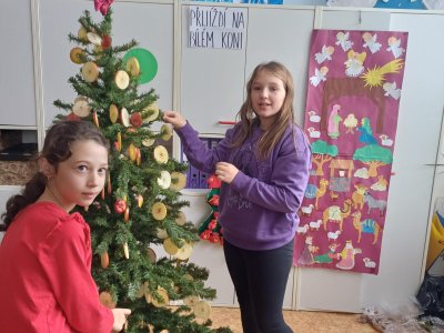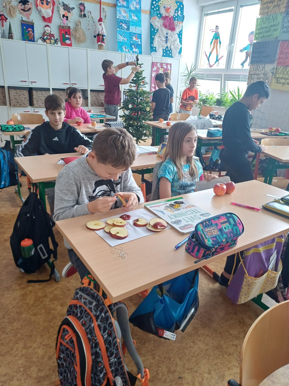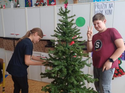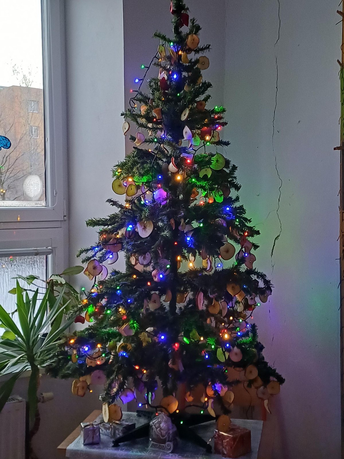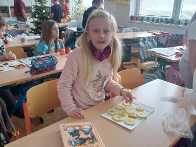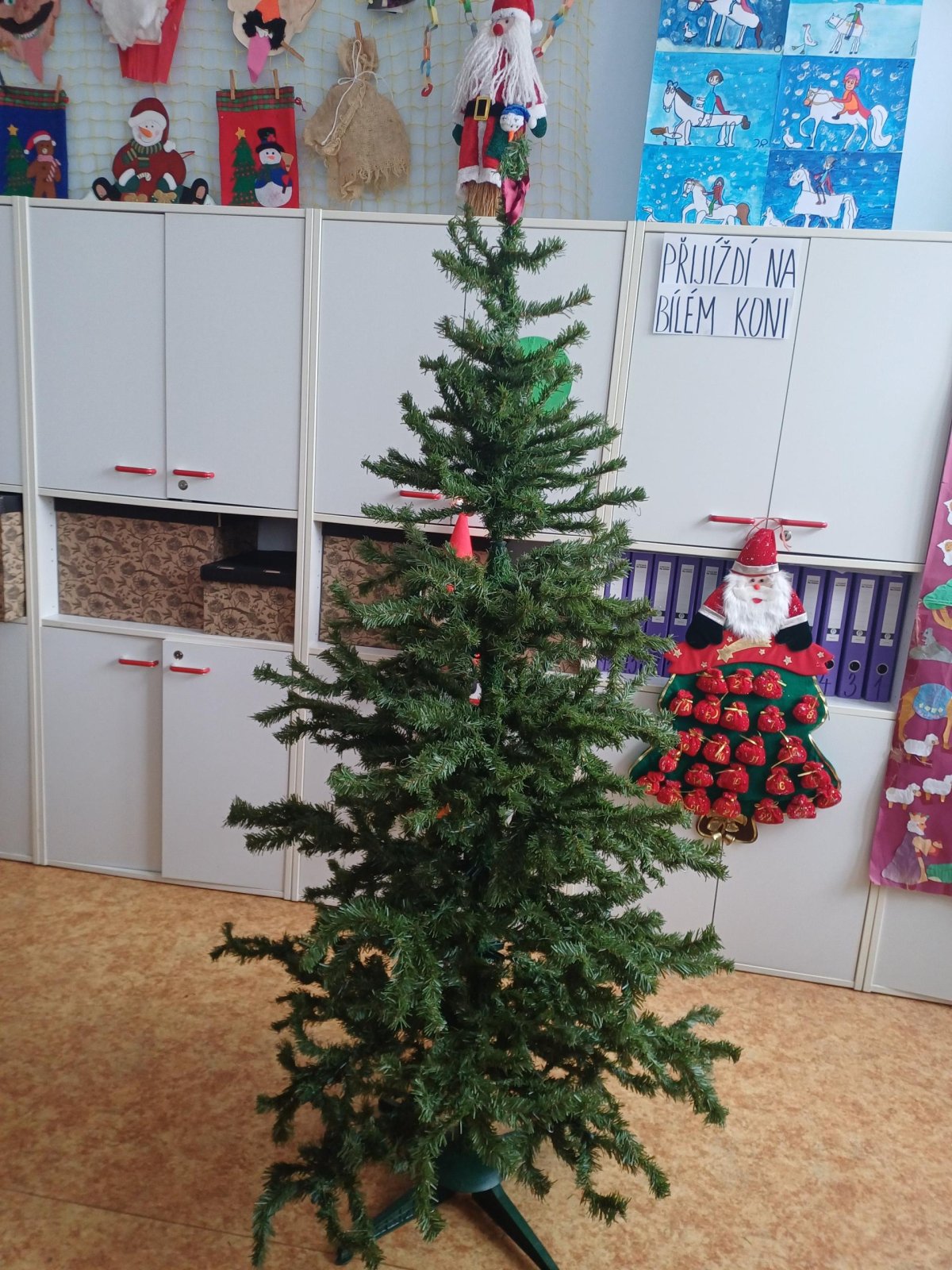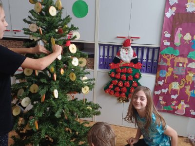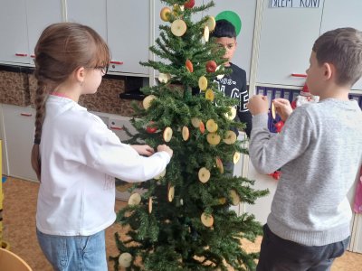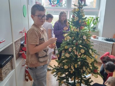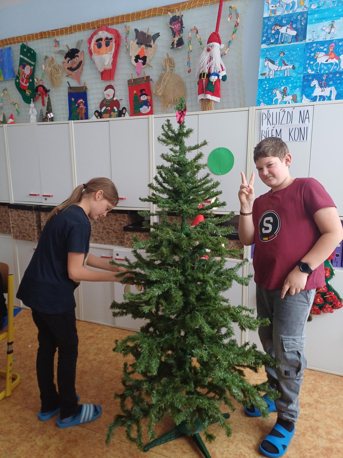 Ve čtvrteční hodině ČLSP opět přišel čas na ozdobení vánočního stromečku. Každý si přinesl jablko, paní učitelka krájela na tenké plátky. My jsme pak pečlivě navlékli háček na jablko a připevnili jsme každý plátek na stromeček. Na závěr jsme rozvěsili svíčky a stromeček byl za hodinu nastrojený. Opravdu mu to sluší!