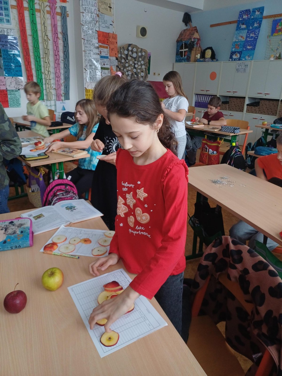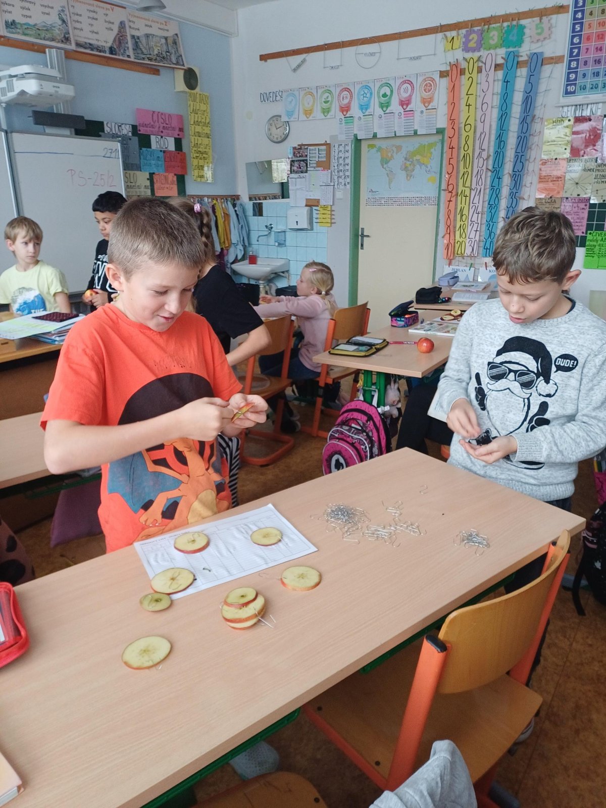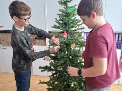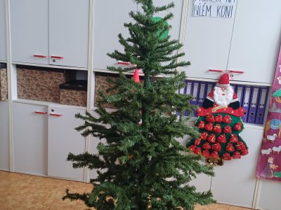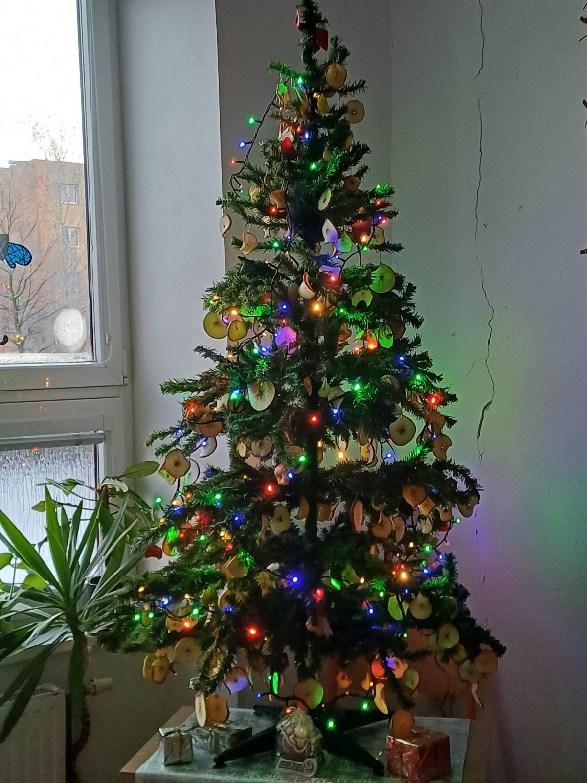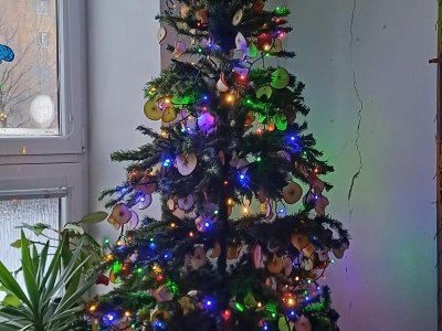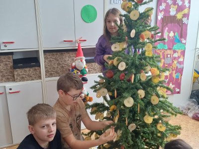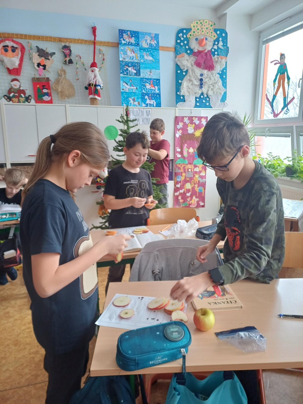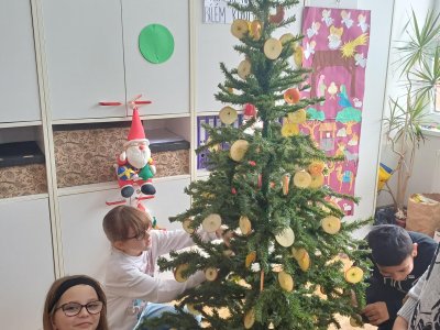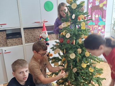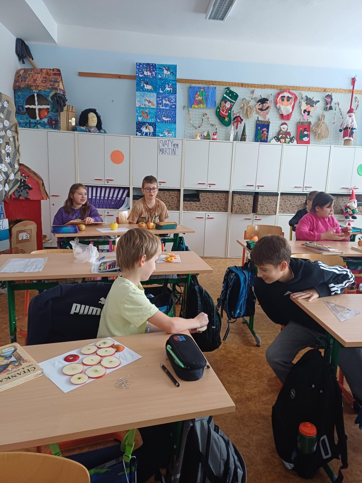 Ve čtvrteční hodině ČLSP opět přišel čas na ozdobení vánočního stromečku. Každý si přinesl jablko, paní učitelka krájela na tenké plátky. My jsme pak pečlivě navlékli háček na jablko a připevnili jsme každý plátek na stromeček. Na závěr jsme rozvěsili svíčky a stromeček byl za hodinu nastrojený. Opravdu mu to sluší!