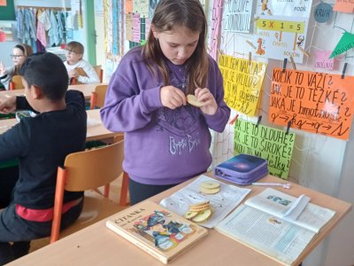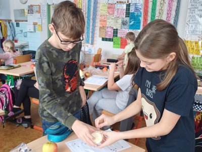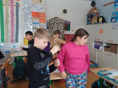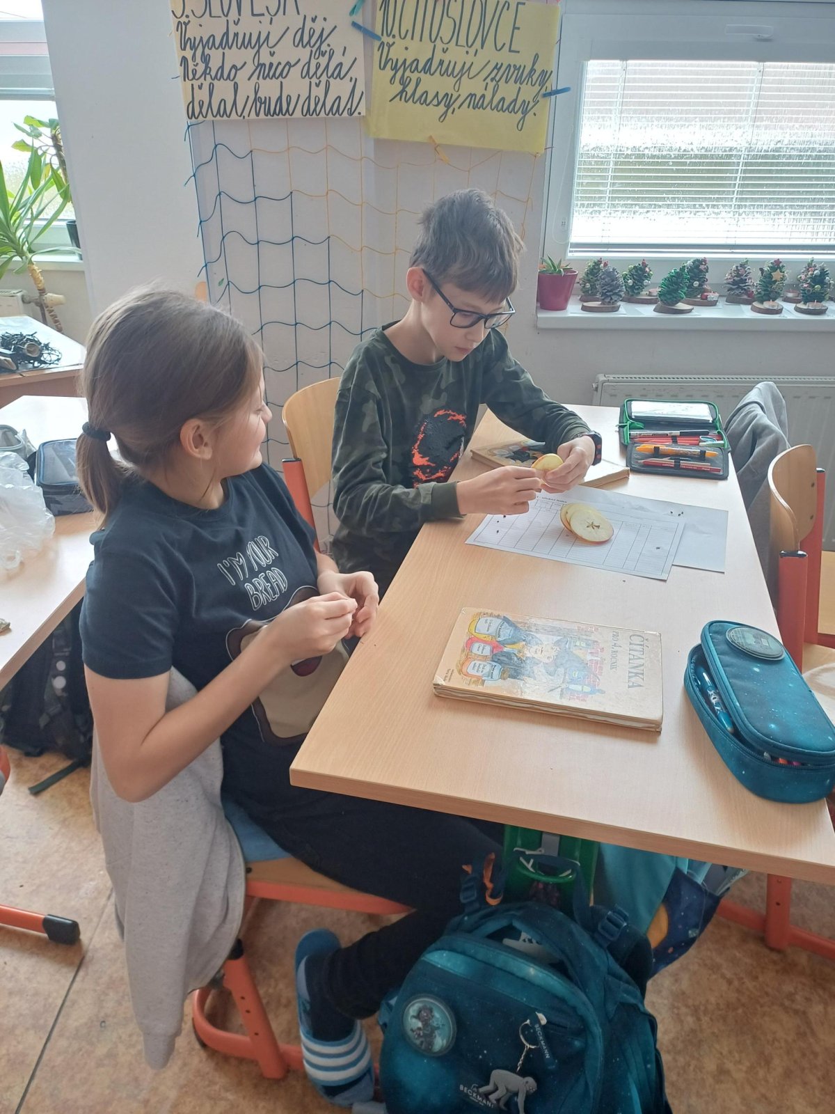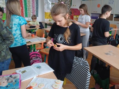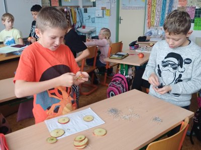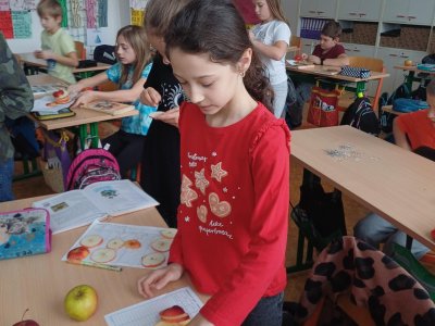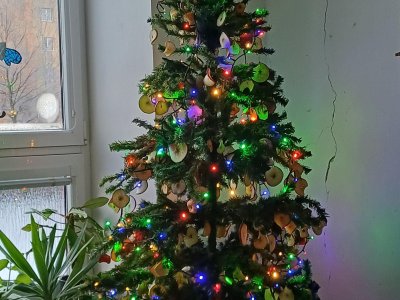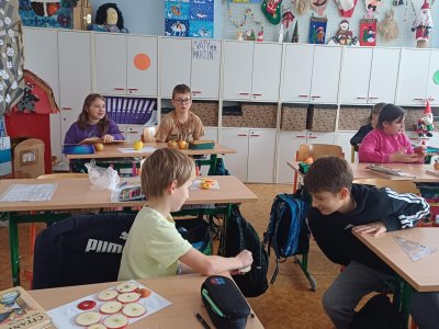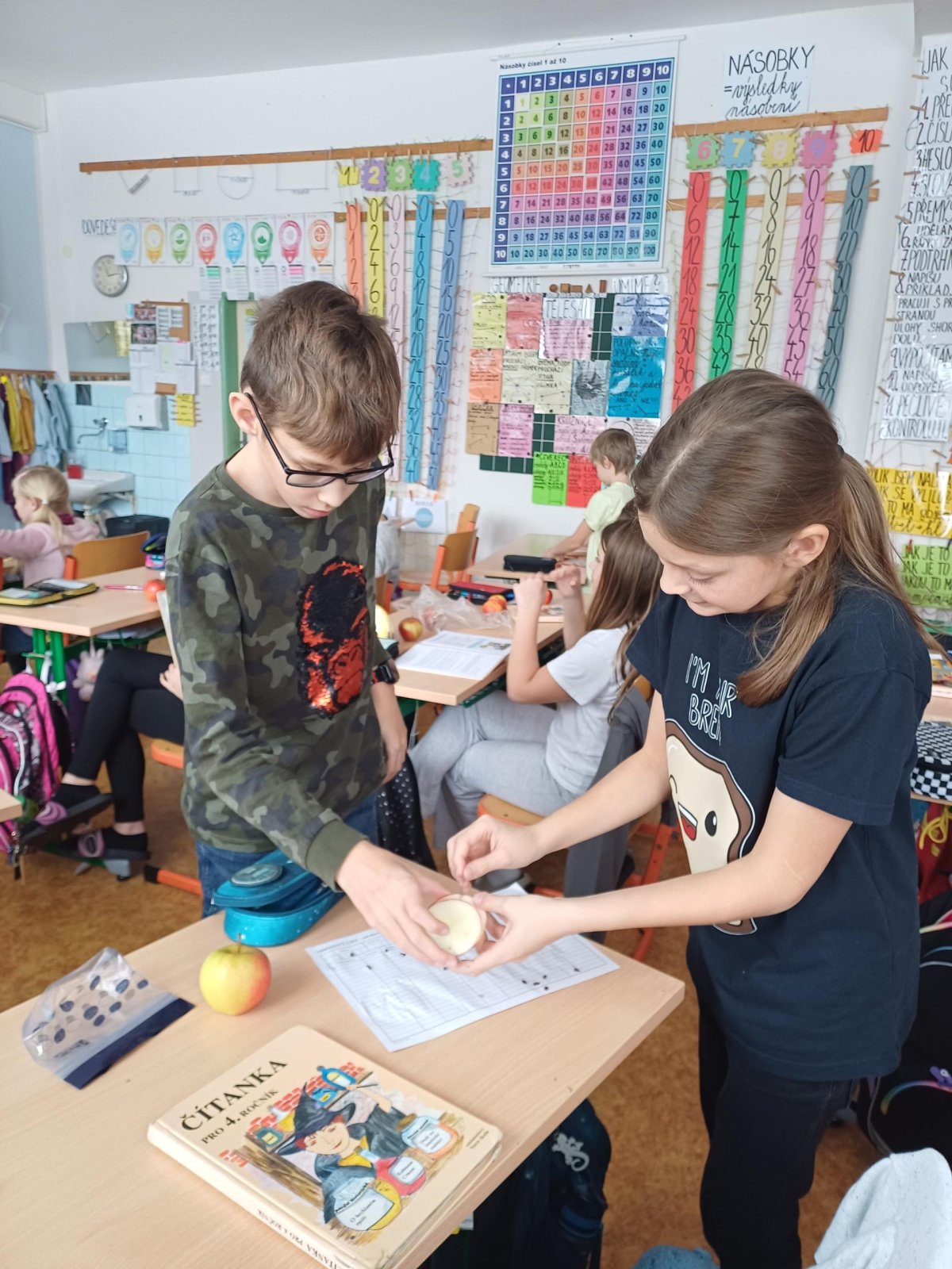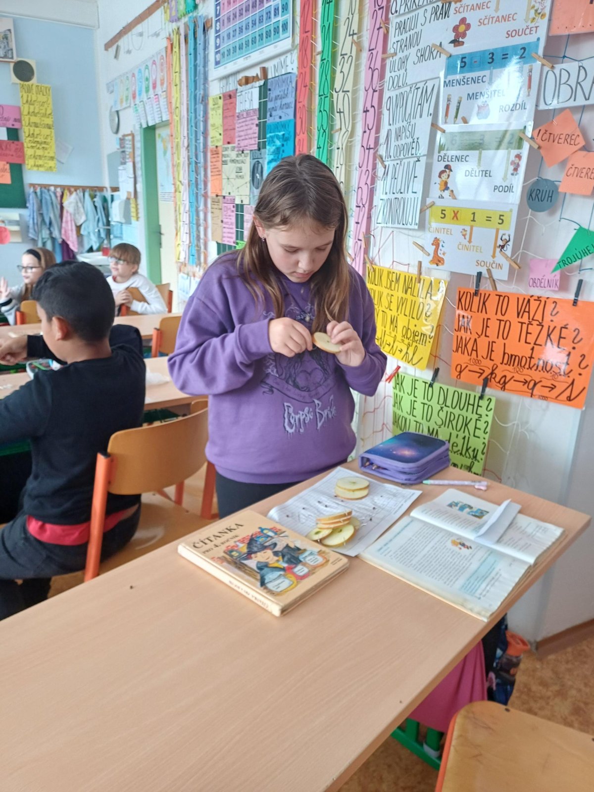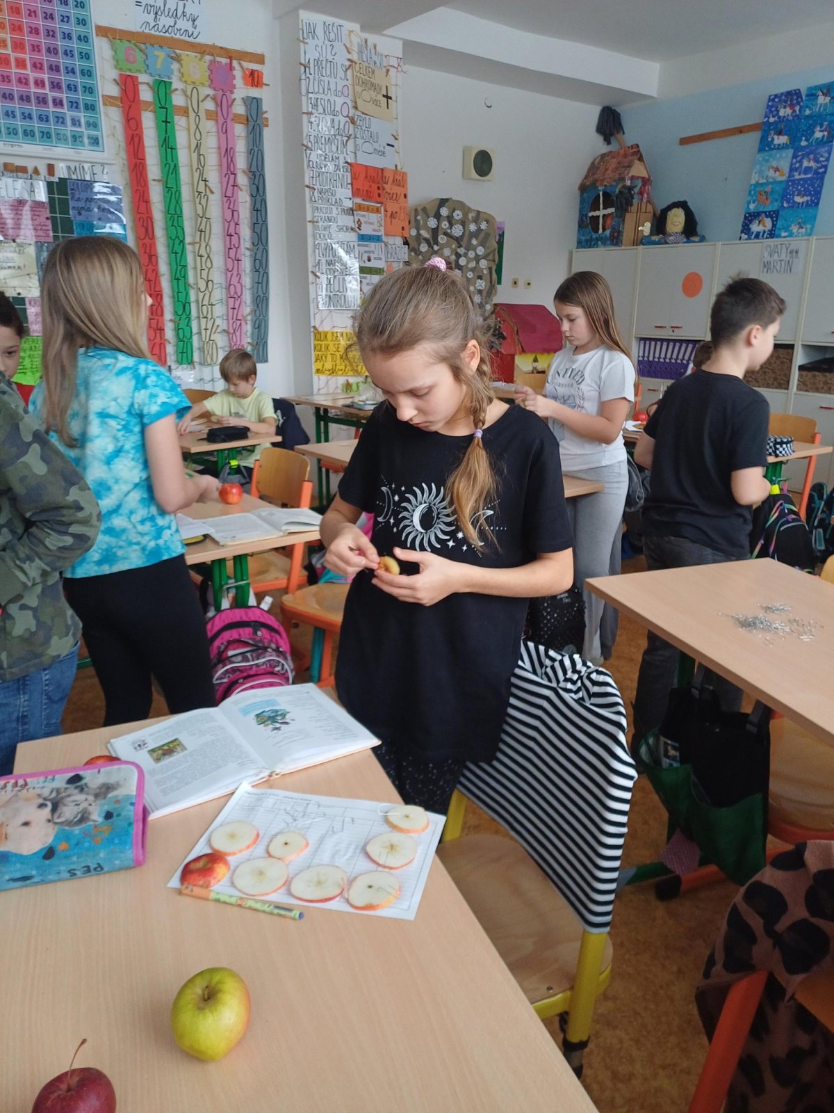 Ve čtvrteční hodině ČLSP opět přišel čas na ozdobení vánočního stromečku. Každý si přinesl jablko, paní učitelka krájela na tenké plátky. My jsme pak pečlivě navlékli háček na jablko a připevnili jsme každý plátek na stromeček. Na závěr jsme rozvěsili svíčky a stromeček byl za hodinu nastrojený. Opravdu mu to sluší!